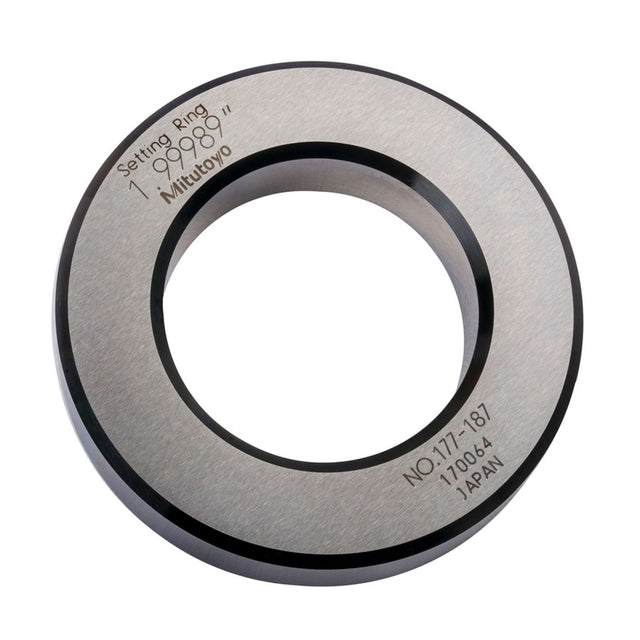 Un anillo de fijado Mitutoyo de acero para un ajuste rápido y exacto de medidores de agujeros con carátula, medidores Holtest, y Micrómetro de interiores. El valor de calibración real para el diámetro esta marcado en cada anillo.
