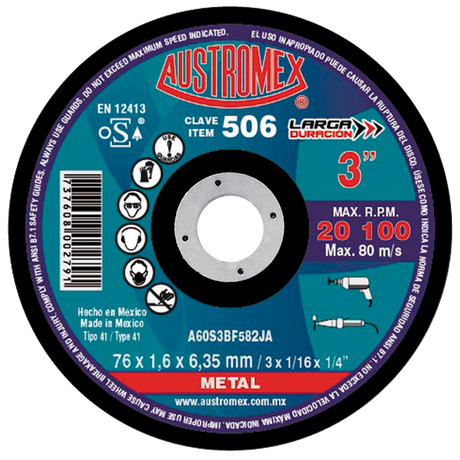 Disco de corte, tipo 41, medidas 3 pulg X 1/16 pulg X 1/4 pulg