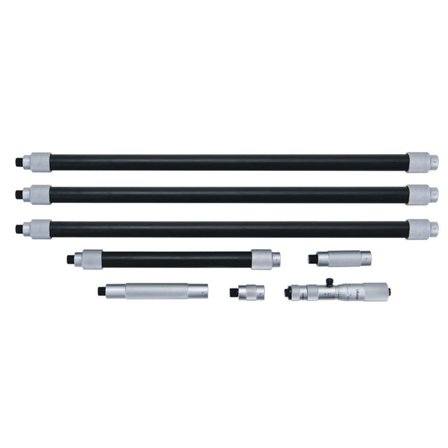 Micrómetro de interiores Mitutoyo que recupera un intervalo de medición mediante el uso de un conjunto de tubos de extensión intercambiables que se pueden usar solos o en combinación. La cabeza micrométrica tiene un acabado en cromo satinado