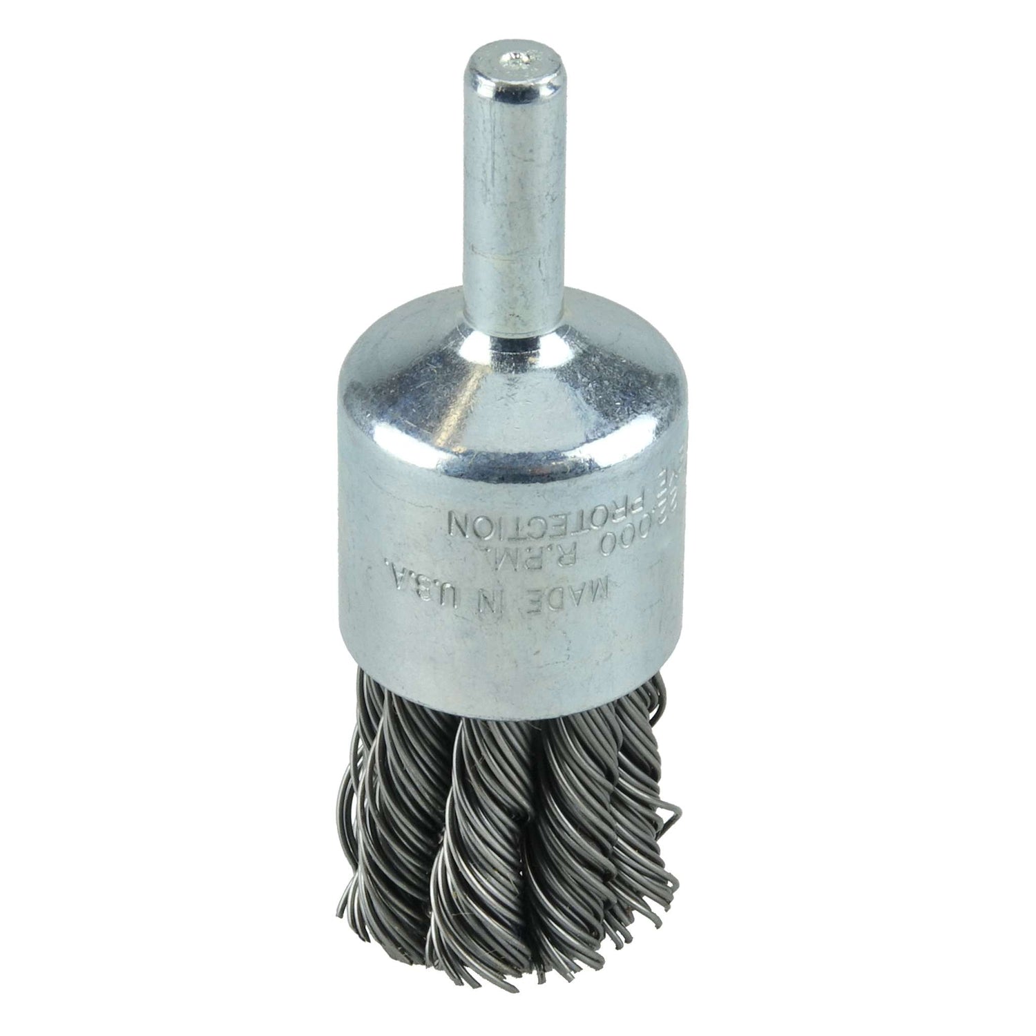 Cepillo de punta de 1-1/8" con alambre trenzado calibre .020". Diseñado para limpieza industrial pesada, brinda resistencia y durabilidad en trabajos continuos de desbaste.