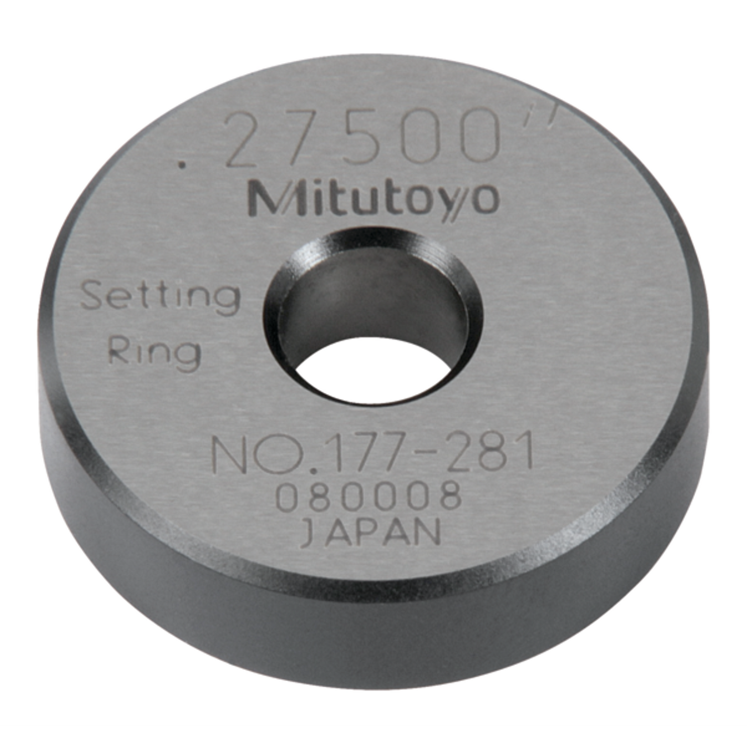 Un anillo de fijado Mitutoyo de acero para un ajuste rápido y exacto de medidores de agujeros con carátula, medidores Holtest, y Micrómetro de interiores. El valor de calibración real para el diámetro esta marcado en cada anillo.