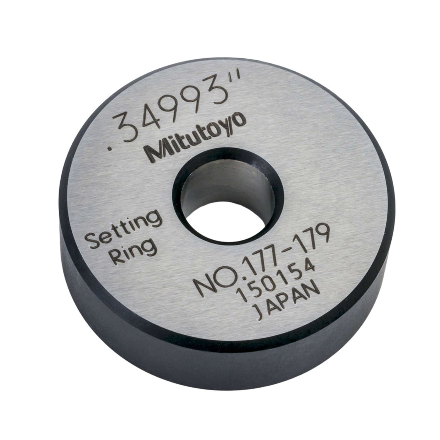Un anillo de fijado Mitutoyo de acero para un ajuste rápido y exacto de medidores de agujeros con carátula, medidores Holtest, y Micrómetro de interiores. El valor de calibración real para el diámetro esta marcado en cada anillo.