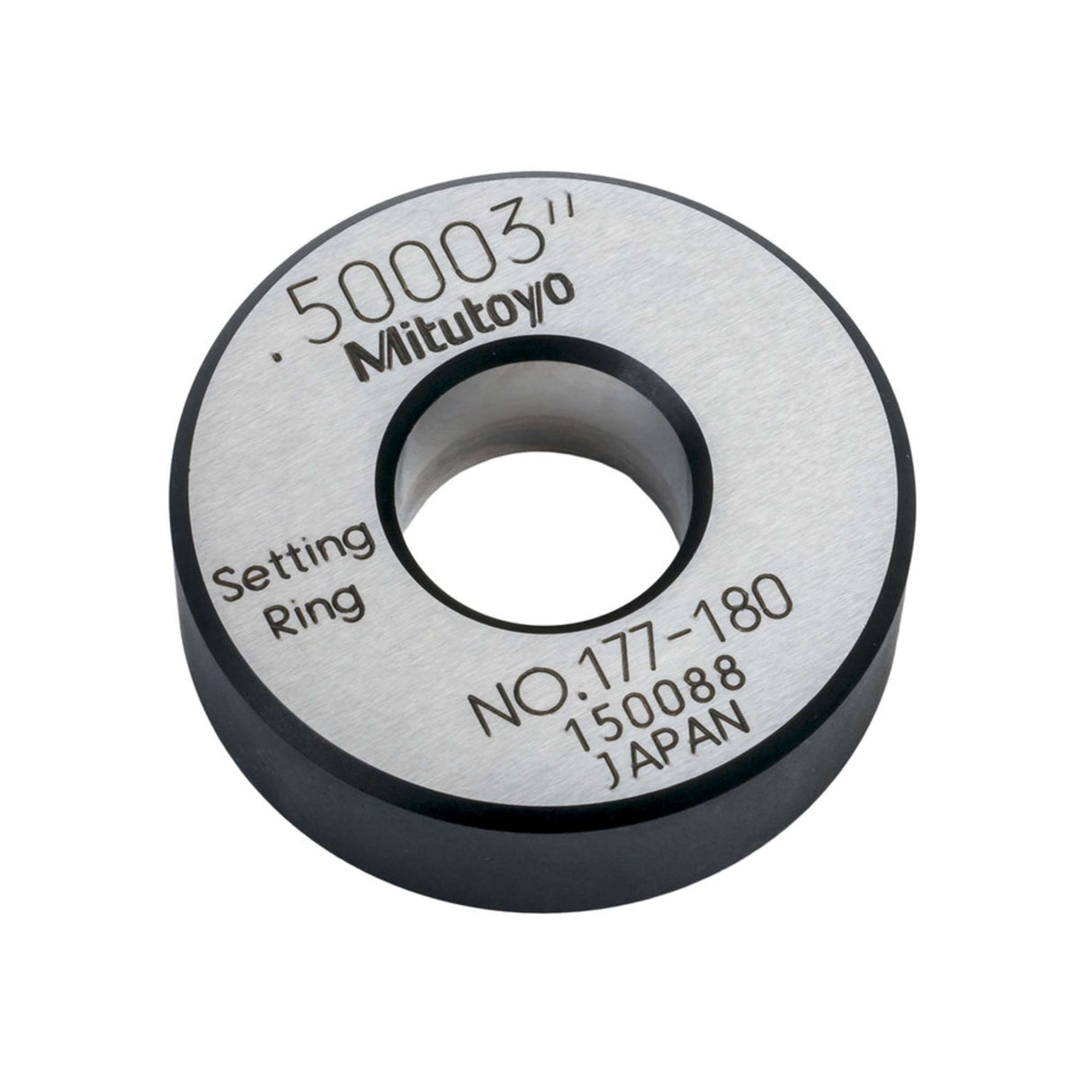 Un anillo de fijado Mitutoyo de acero para un ajuste rápido y exacto de medidores de agujeros con carátula, medidores Holtest, y Micrómetro de interiores. El valor de calibración real para el diámetro esta marcado en cada anillo.