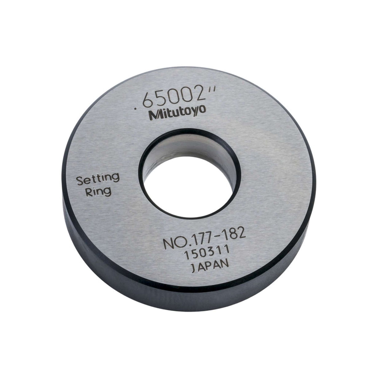 Un anillo de fijado Mitutoyo de acero para un ajuste rápido y exacto de medidores de agujeros con carátula, medidores Holtest, y Micrómetro de interiores. El valor de calibración real para el diámetro esta marcado en cada anillo.