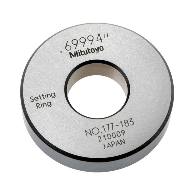Un anillo de fijado Mitutoyo de acero para un ajuste rápido y exacto de medidores de agujeros con carátula, medidores Holtest, y Micrómetro de interiores. El valor de calibración real para el diámetro esta marcado en cada anillo.