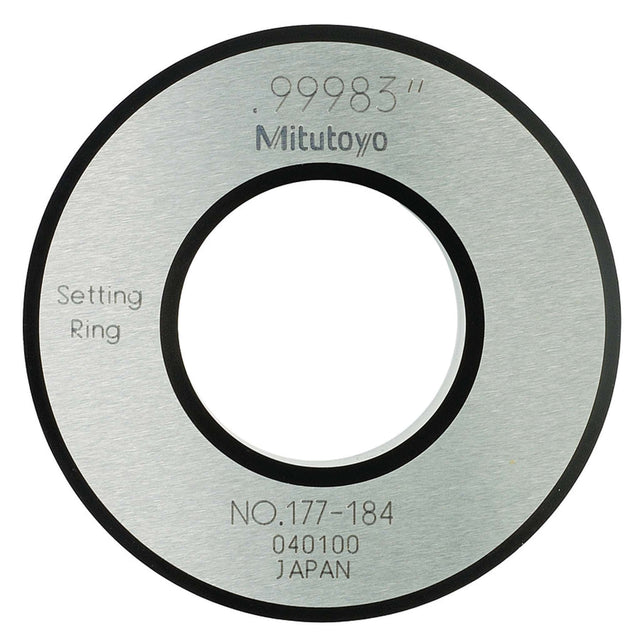 Un anillo de fijado Mitutoyo de acero para un ajuste rápido y exacto de medidores de agujeros con carátula, medidores Holtest, y Micrómetro de interiores. El valor de calibración real para el diámetro esta marcado en cada anillo.