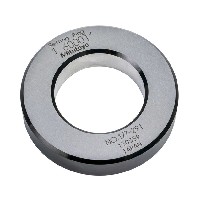 Un anillo de fijado Mitutoyo de acero para un ajuste rápido y exacto de medidores de agujeros con carátula, medidores Holtest, y Micrómetro de interiores. El valor de calibración real para el diámetro esta marcado en cada anillo.