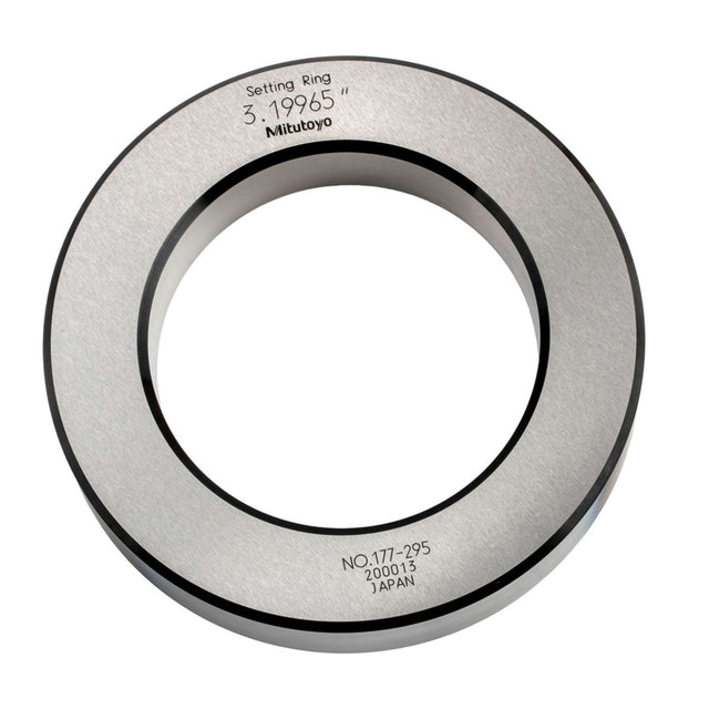 Un anillo de fijado Mitutoyo de acero para un ajuste rápido y exacto de medidores de agujeros con carátula, medidores Holtest, y Micrómetro de interiores. El valor de calibración real para el diámetro esta marcado en cada anillo.