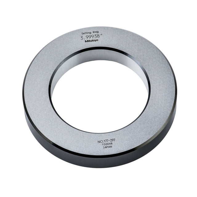 Un anillo de fijado Mitutoyo de acero para un ajuste rápido y exacto de medidores de agujeros con carátula, medidores Holtest, y Micrómetro de interiores. El valor de calibración real para el diámetro esta marcado en cada anillo.