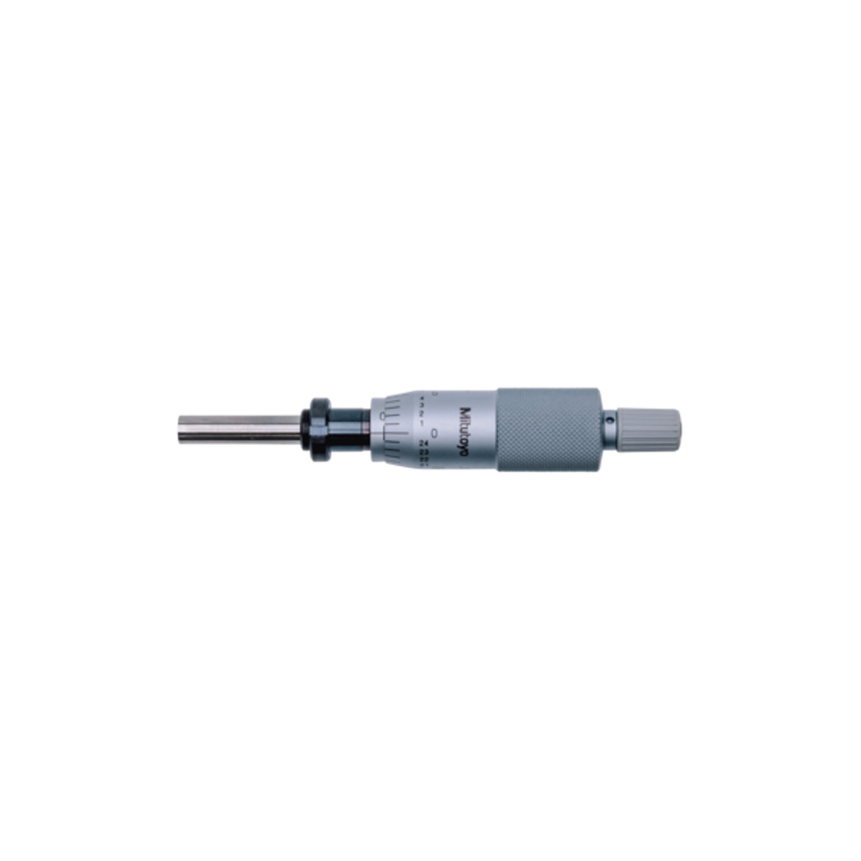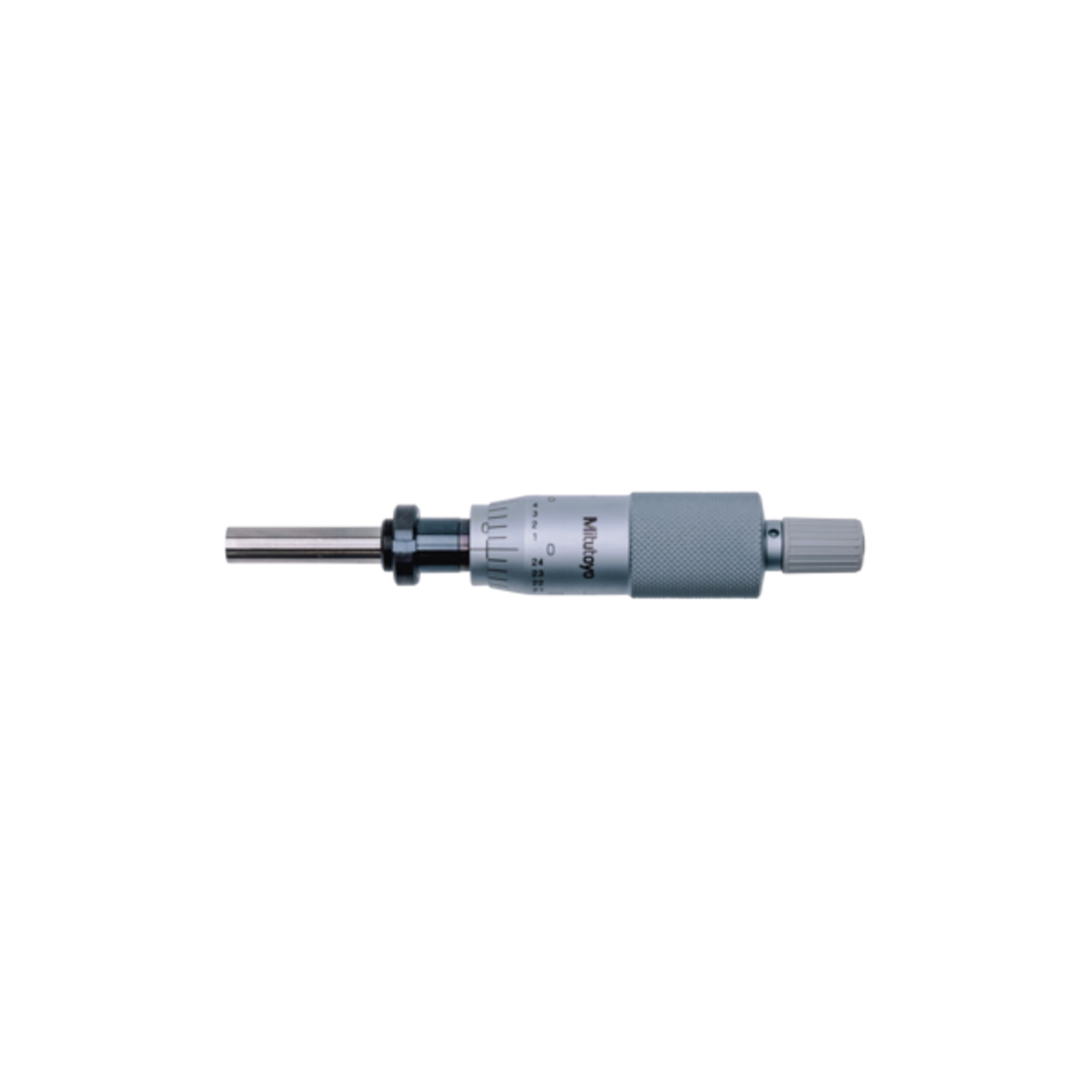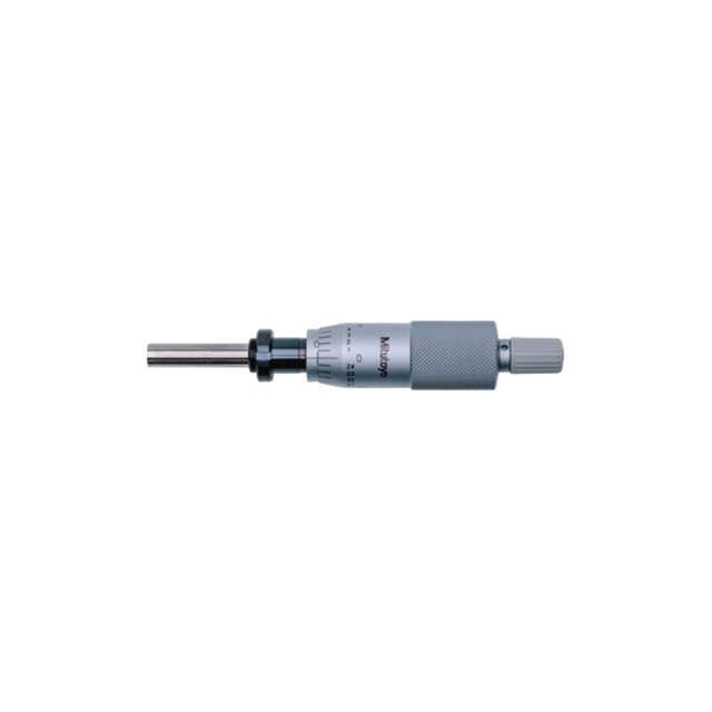 Una cabeza micrométrica Mitutoyo no digital, estándar y de tamaño mediano con vástago de tuerca de sujeción M9.5 y punta de husillo plana de carburo de tungsteno.