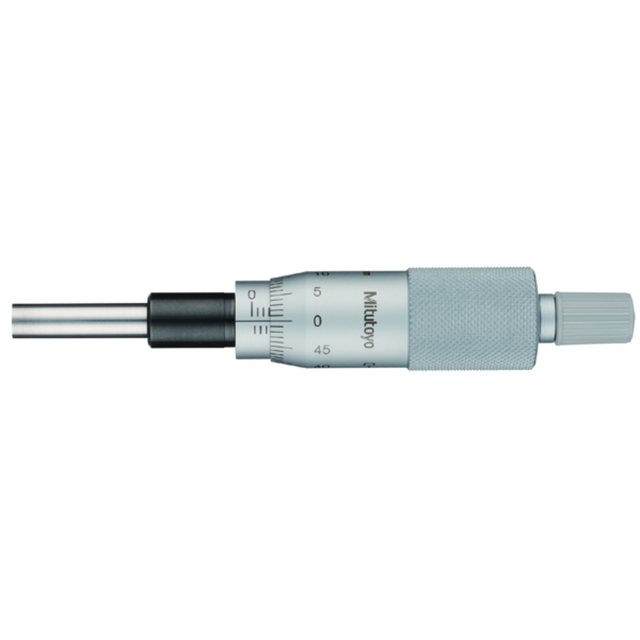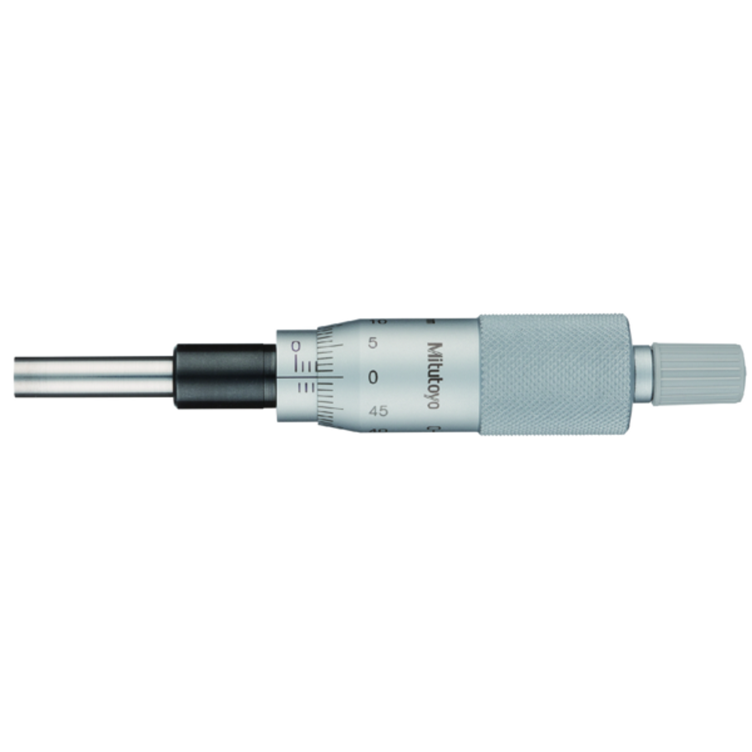 Una cabeza micrométrica Mitutoyo no digital, estándar y de tamaño mediano, con vástago liso de Ø 10 mm y punta de husillo plana de carburo de tungsteno.