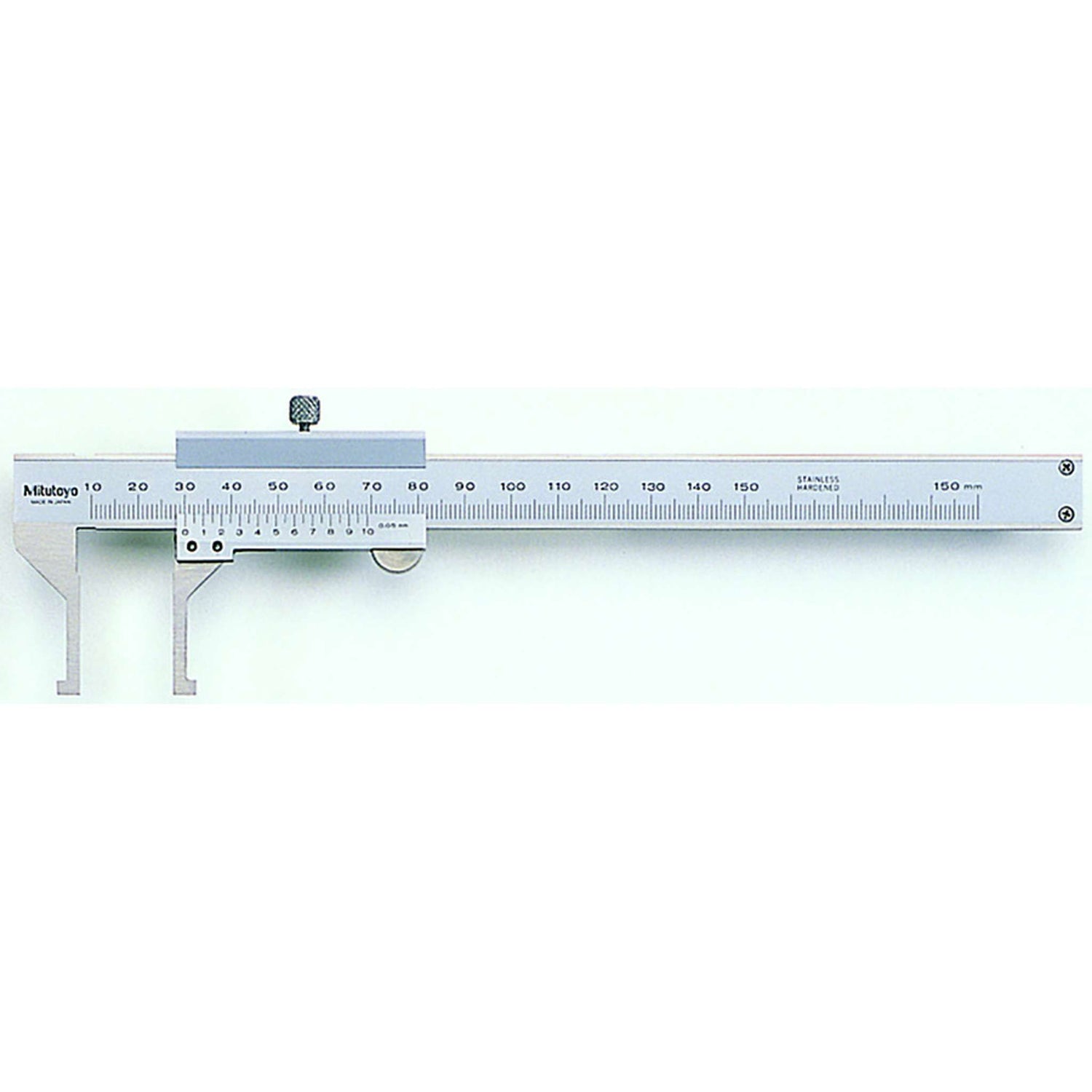 Calibrador vernier Mitutoyo equipado con puntas especiales de tipo ranura interior para medición interior únicamente. Construcción de acero inoxidable endurecido con escalas cromadas satinadas fáciles de leer.