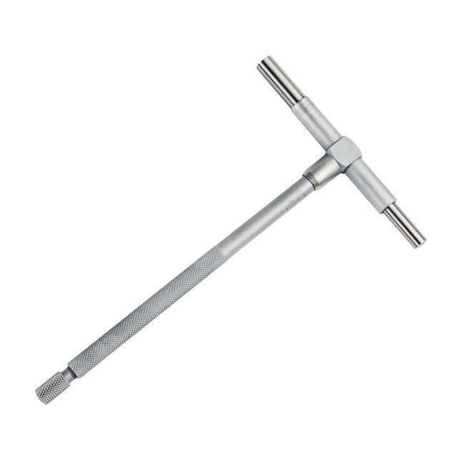 Un medidor de transferencia Mitutoyo que permite medir el diámetro de los agujeros, los orificios o ranuras se medirán con un micrómetro exterior o un calibrador. En funcionamiento, el vástago con resorte se expande dentro de la característica a medir y luego se bloquea en su lugar usando el control giratorio moleteado en el extremo de la empuñadura. En la práctica, es necesaria cierta manipulación para garantizar que se haya capturado el tamaño mínimo, después de lo cual se retira cuidadosamente el medidor para que se pueda medir la dimensión a través de las superficies de contacto.