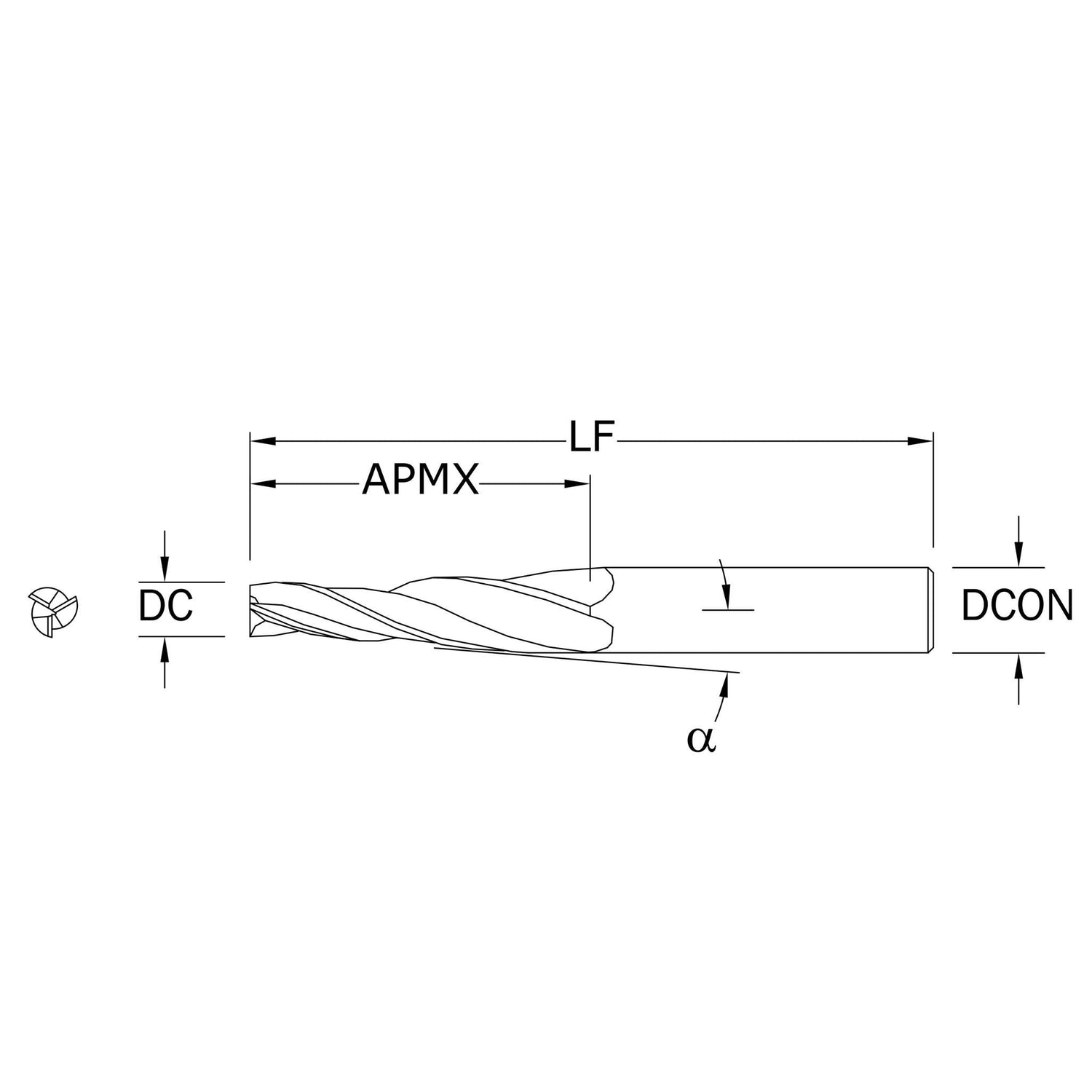 Cortador Vertical de Propósito General, Diam. 3/32 pulg, 3 Flautas, Punta Cónica Plana