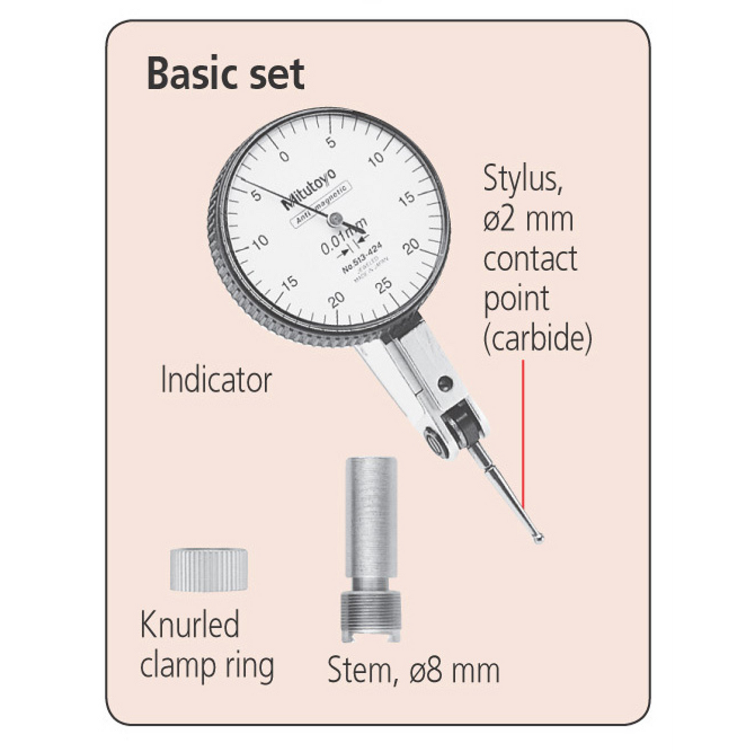 Versátil indicador de palanca de tipo antimagnético de Mutoyo (o Indicador de carátula tipo palanca, DTI) adecuado para operaciones de alineación en máquinas herramienta y aplicaciones similares. Este indicador se adapta automáticamente a la dirección de medición requerida al hacer contacto, y el movimiento enjoyado proporciona la menor fricción y rigidez para un funcionamiento suave y exacto. Se suministra con un juego básico de accesorios de montaje.