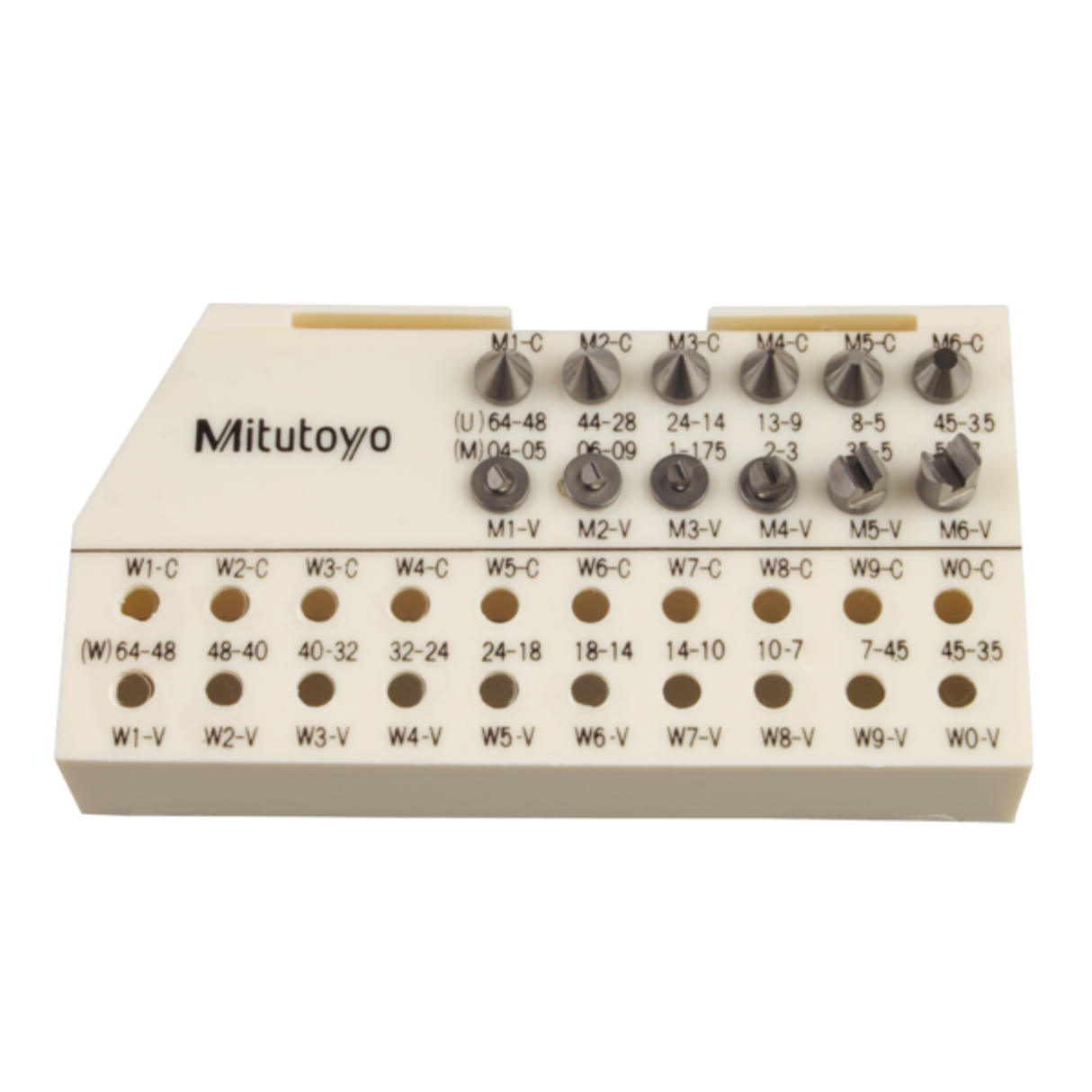 El juego de puntas de tope y husillo Mitutoyo para adaptarse a los micrómetros de rosca de tornillo Serie 126/326 para cubrir los intervalos de paso métrico de 0.4 a 7 mm y unificado de 64 a 3.5 TPI.