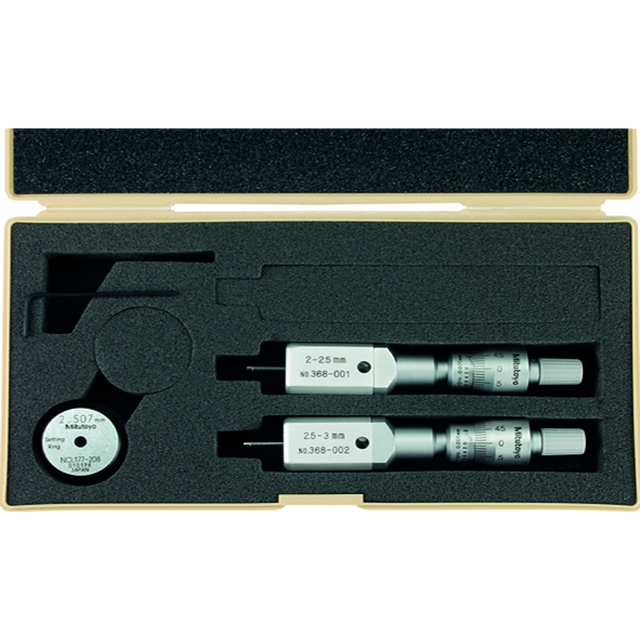 Este es un juego de micrómetros internos de tres o dos puntos que ofrece los siguientes beneficios: Juego de unidad completa. Superficie de medición de carburo (intervalo de 2 a 6 mm) Perno de medición recubierto de titanio (intervalo 6 mm) le brinda una excelente durabilidad y resistencia al impacto. Entregado con Anillo de fijado