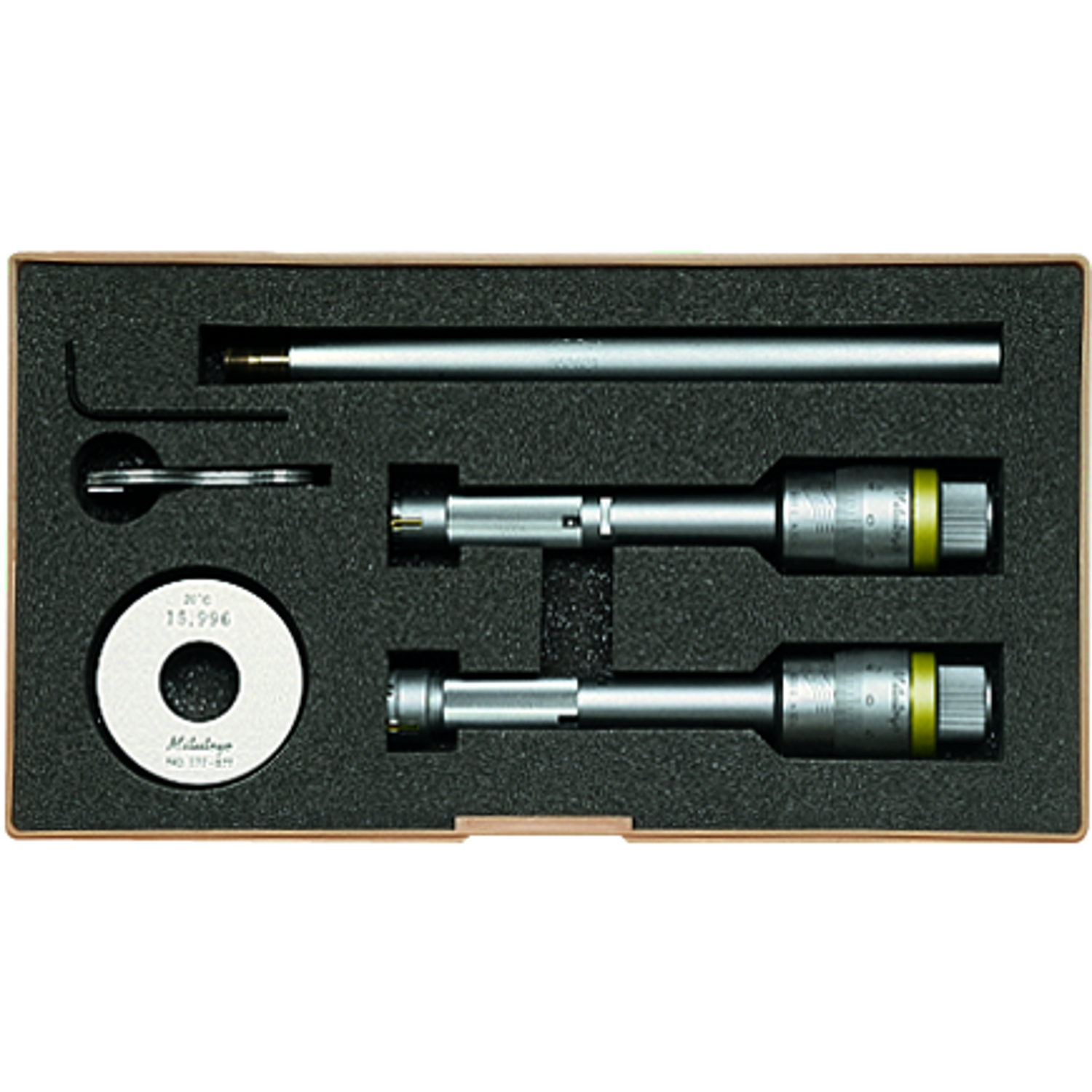 Este es un juego de micrómetros internos de 3 puntos que ofrece los siguientes beneficios: Medición estable mediante centrado automático Superficie de medición de carburo (intervalo de 2 a 6 mm) 1 Anillo de fijado and 1 extension