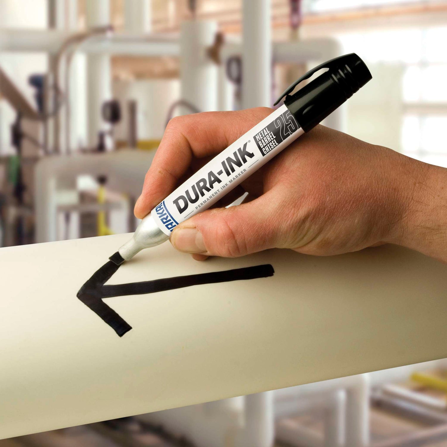 El marcador de tinta DURA-INK® de punta de cincel de tinta permanente. La punta de cincel versátil puede realizar marcas gruesas o finaspara satisfacer distintas necesidades relacionadas con el marcaje. La tinta industrial resistente al agua y a los borrones permite realizar marcas duraderas. El tubo metálico reforzado contiene un suministro de tinta extragrande para ofrecer una vida útil más prolongada
