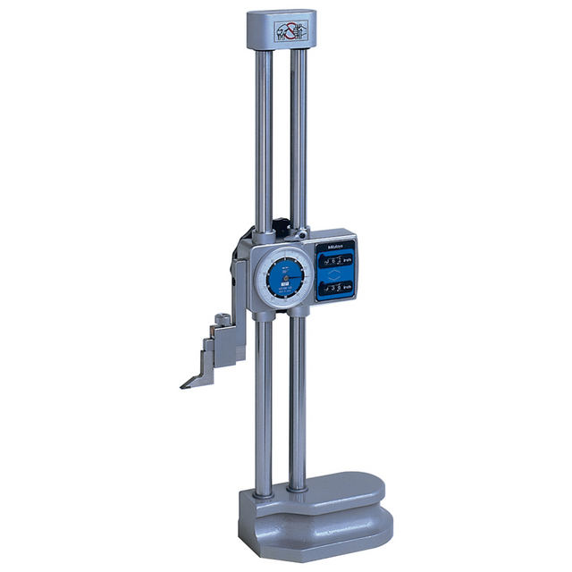 Medidor de alturas Mitutoyo con Contador carátula/mecánico , diseño de doble columna. Dos Contadores separados propocionan capacidad de medición arriba/abajo configurable independientemente, con el indicado mostrando las últimas fracciones decimales.