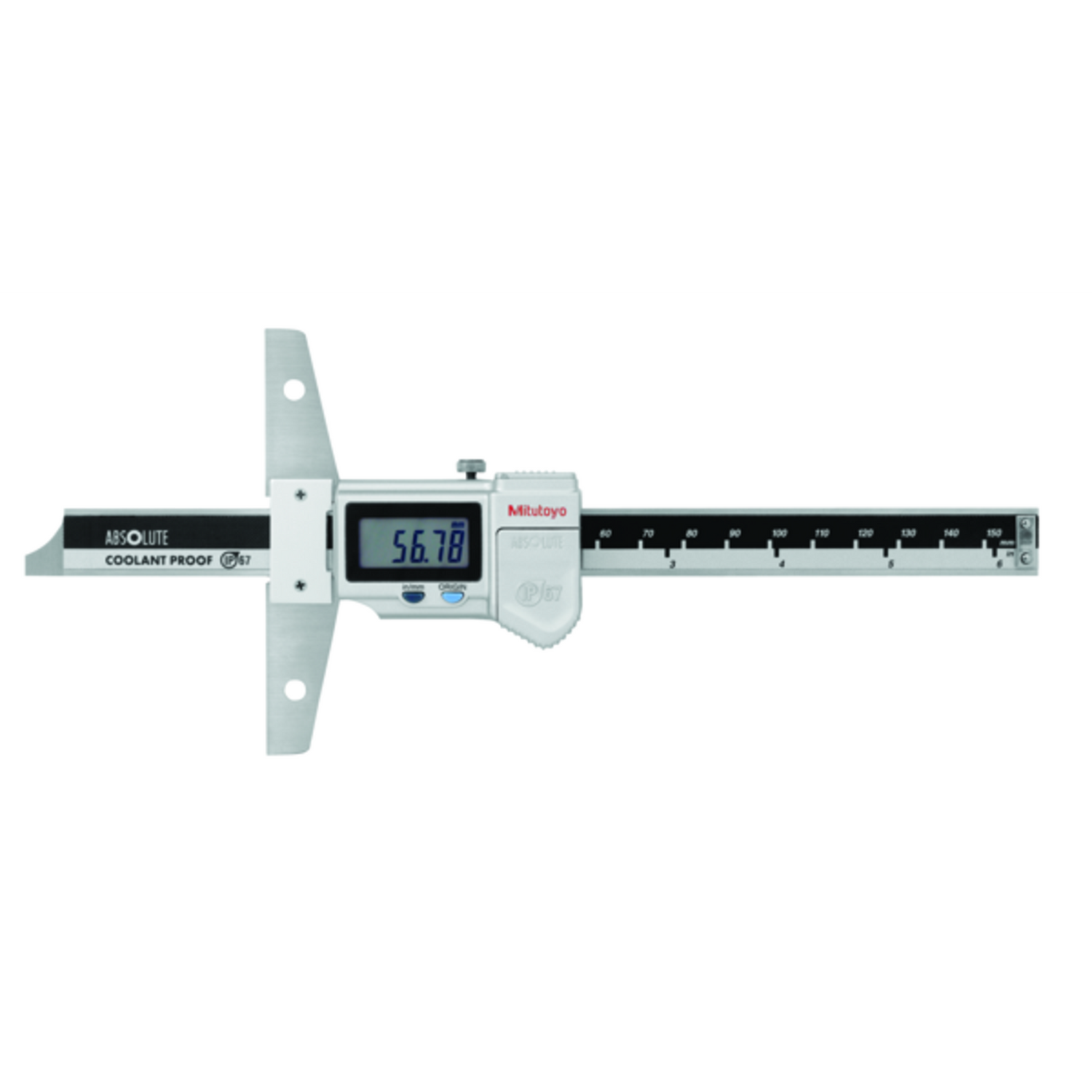 Medidor para profundidad Digital Mitutoyo a prueba de agua, adecuado para su uso en presencia de refrigerante o aceite de corte. adecuado para su uso en presencia de refrigerante o aceite de corte, Construcción de acero inoxidable endurecido con 9.8 pulg de base. Escala del sistema ABSOLUTE sin errores, medición de alta velocidad. Salida de datos SPC.