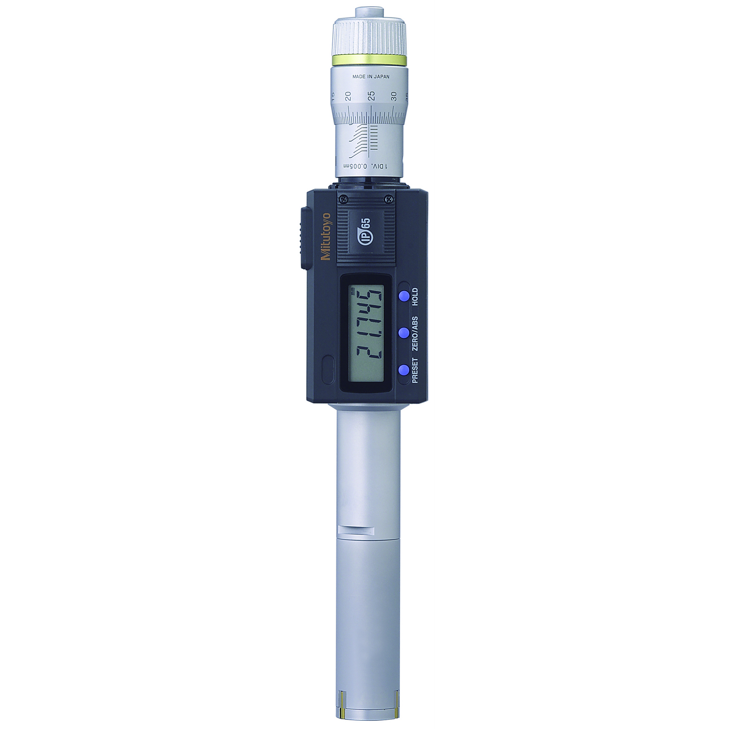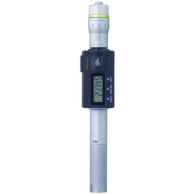 Micrómetros internos de tres puntos que ofrecen los siguientes beneficios: micrómetro individual. Los pernos de medición recubiertas de titanio le brindan una excelente durabilidad y resistencia al impacto. Además cuentan con una excelente resistencia al agua y al polvo (nivel de protección IP65), lo que le permite utilizar este producto en situaciones de mecanizado que incluyen salpicaduras de líquido refrigerante. Gran pantalla LCD con altura de caracteres de 7,5 mm le permite leer las mediciones fácilmente. Sin anillo de fijado o extensiones.