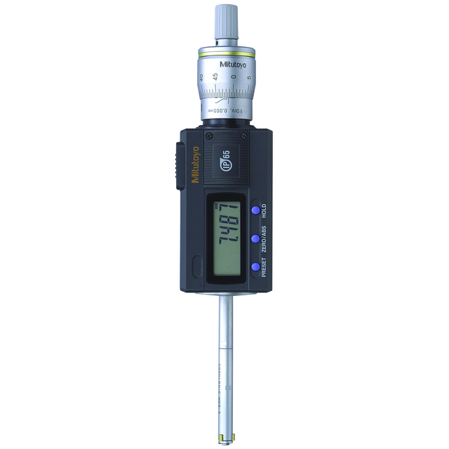 Micrómetros internos de tres puntos que ofrecen los siguientes beneficios: micrómetro individual. Los pernos de medición recubiertas de titanio le brindan una excelente durabilidad y resistencia al impacto. Además cuentan con una excelente resistencia al agua y al polvo (nivel de protección IP65), lo que le permite utilizar este producto en situaciones de mecanizado que incluyen salpicaduras de líquido refrigerante. Gran pantalla LCD con altura de caracteres de 7,5 mm le permite leer las mediciones fácilmente. Sin anillo de fijado o extensiones.