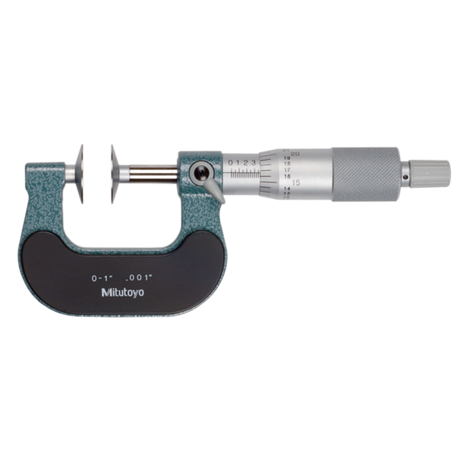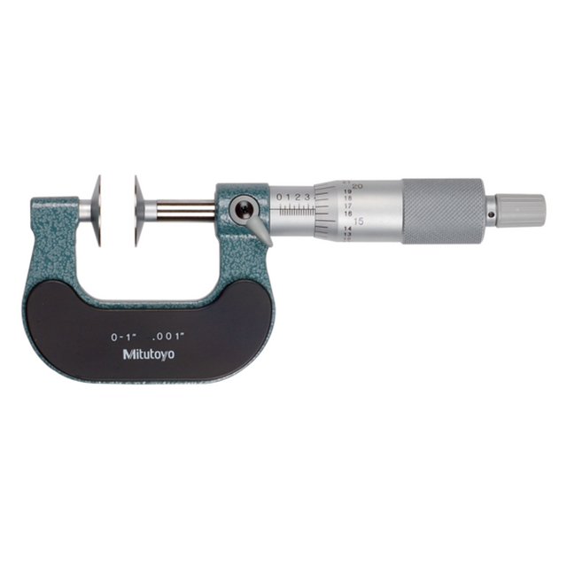 Un micrómetro no digital Mitutoyo provisto de un husillo con extremo de disco y un tope para permitir la medición de características cubiertas, como los dientes de los engranes. Un Trinquete garantiza una medición repetible.