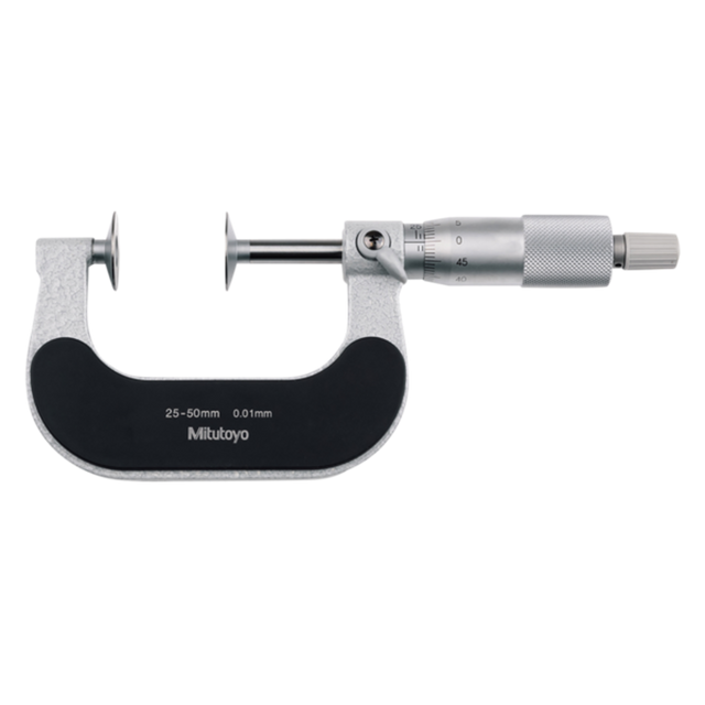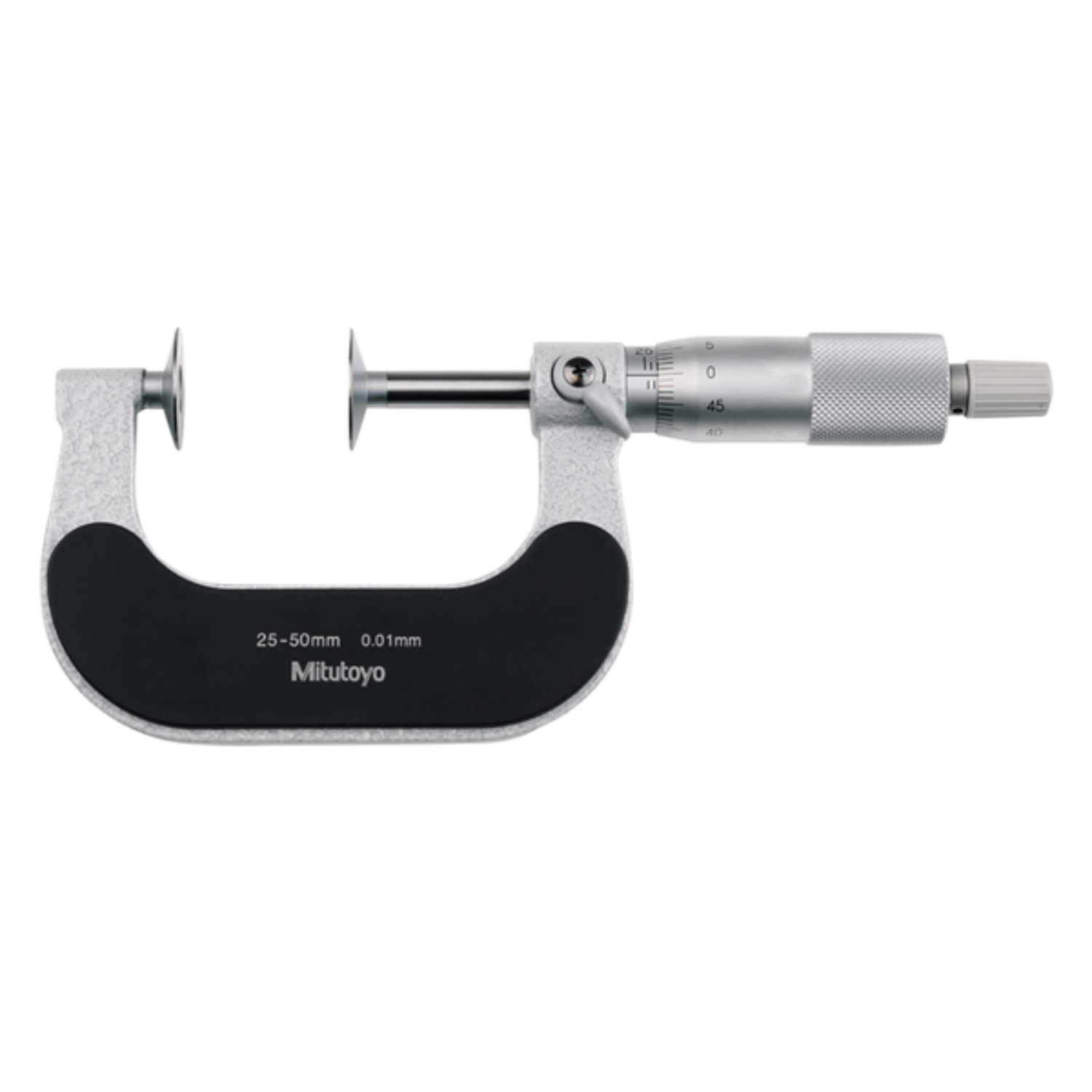 Un micrómetro no digital Mitutoyo provisto de un husillo con extremo de disco y un tope para permitir la medición de características cubiertas, como los dientes de los engranes. UnTrinquete garantiza una medición repetible.