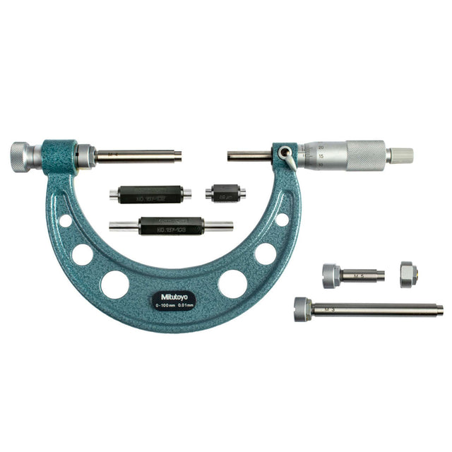 Un micrómetro no digital Mitutoyo provisto de topes fácilmenteintercambiables para permitir un amplio intervalo de medición desde un solo instrumento. Un Trinquete garantiza una medición repetible.