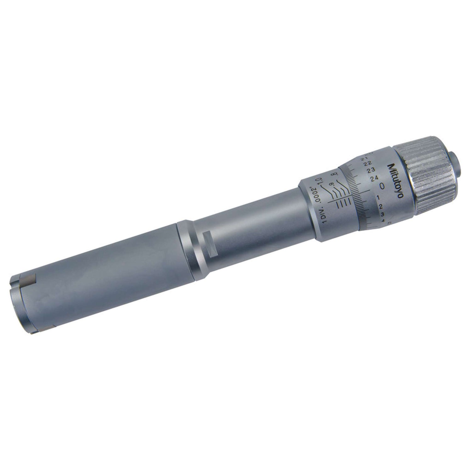 Un medidor de agujeros Mitutoyo no digital. Caras de contacto de acero endurecido. Un trinquete garantiza una medición repetible.