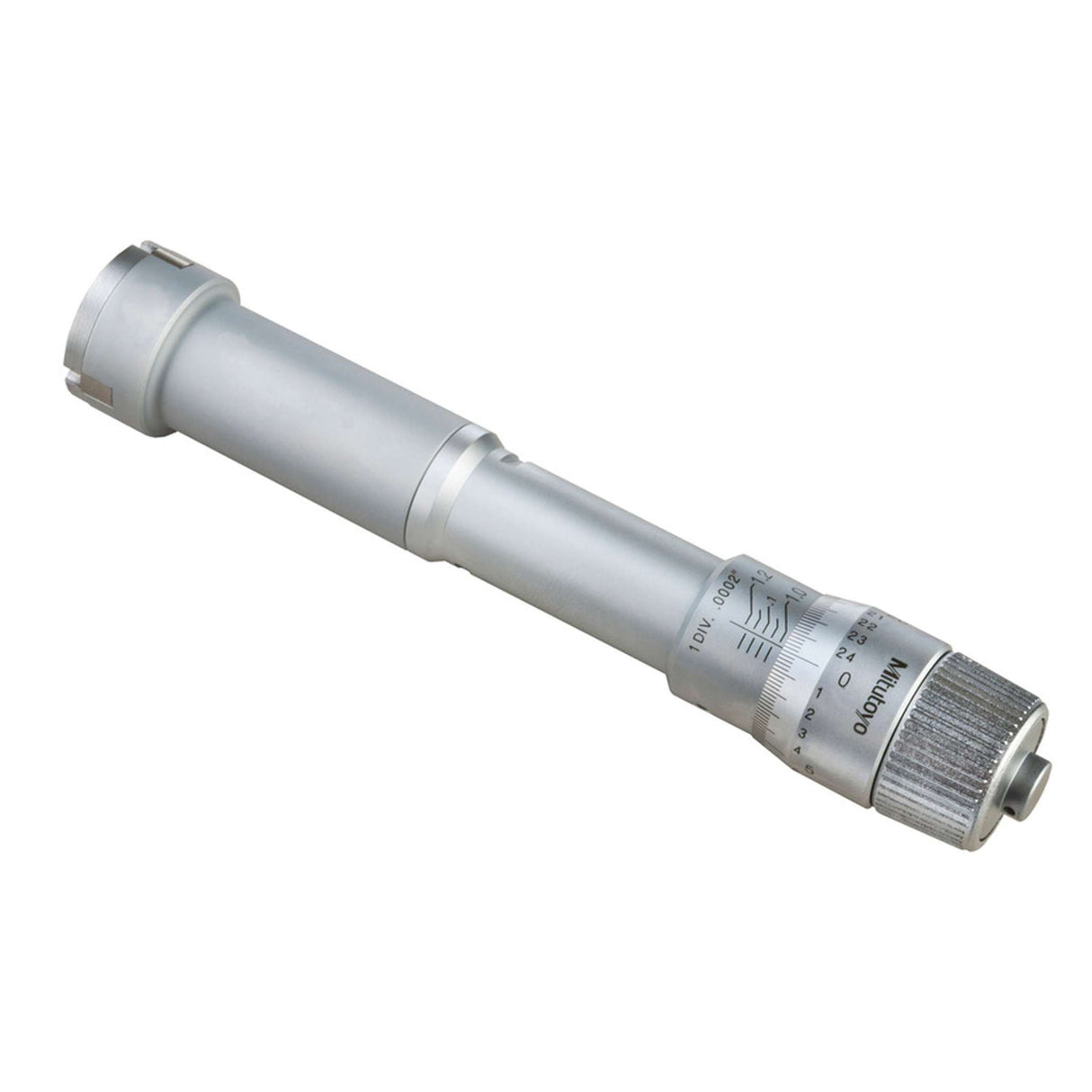 Un medidor de agujeros Mitutoyo no digital. Caras de contacto de acero endurecido. Un trinquete garantiza una medición repetible.