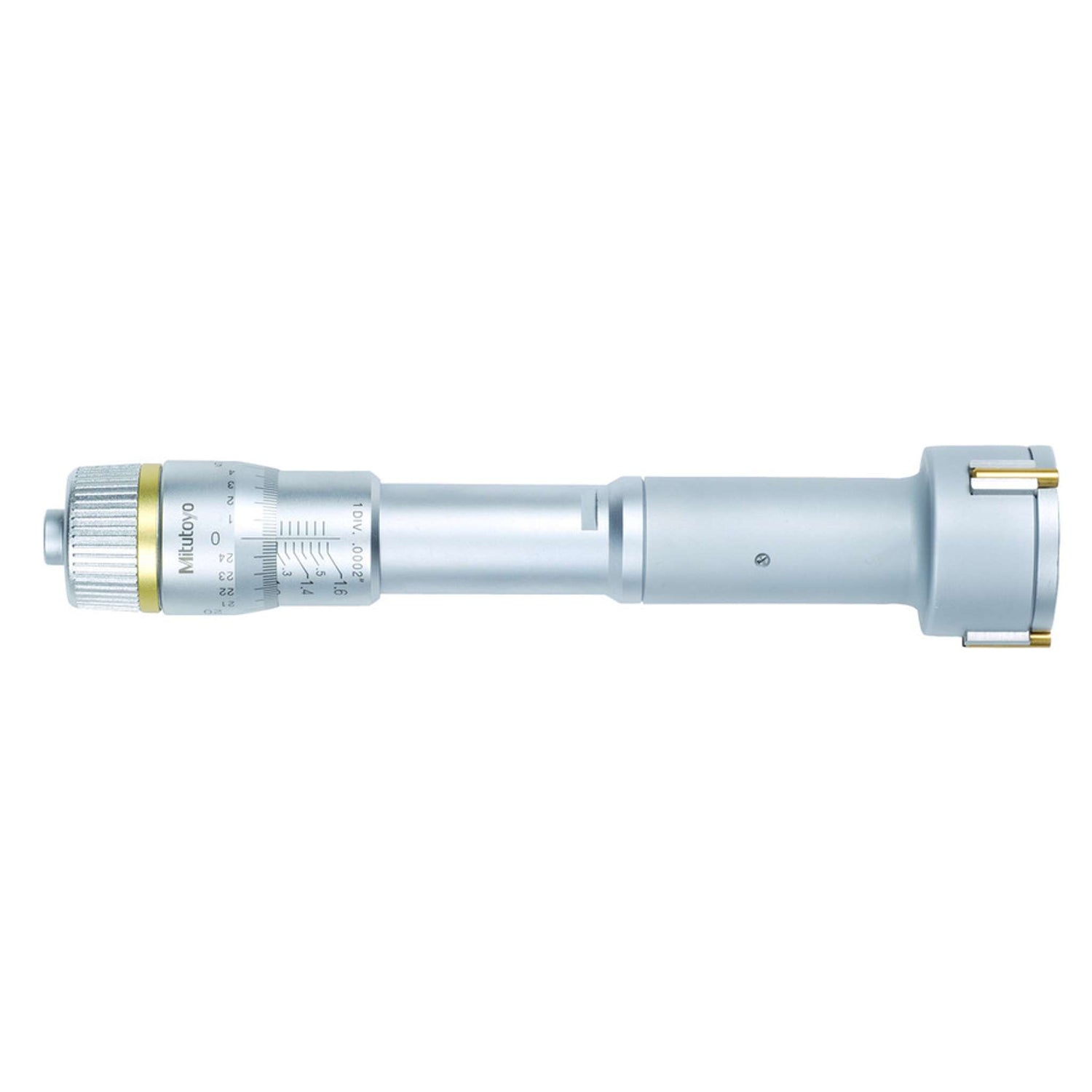 Micrómetros internos de tres y dos puntas le ofrecen los siguientes beneficios: Pernos de medición recubiertos de titanio le brindan una excelente durabilidad y resistencia al impacto (tipo de 3 puntos). El micrómetro de tres puntos permite una medición estable mediante el centrado automático. sin anillo de fijado o extensiones.
