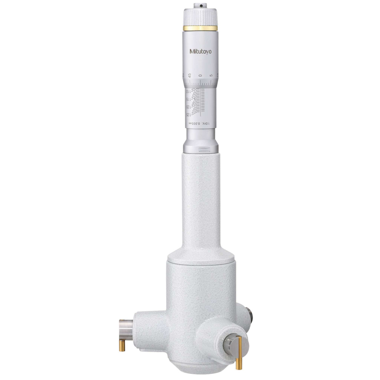Micrómetro para agujeros Mitutoyo de 3 puntas no digital con pernos de medición recubiertos de titanio. El diseño de 3 puntos permite una medición estable mediante centrado automático. La profundidad máxima de medición se puede aumentar en 150 mm utilizando una varilla de extensión opcional si es necesario. El tope de trinquete garantiza una medición repetible. El Anillo de fijación de acero (opcional) está disponible para un ajuste exacto antes de la medición