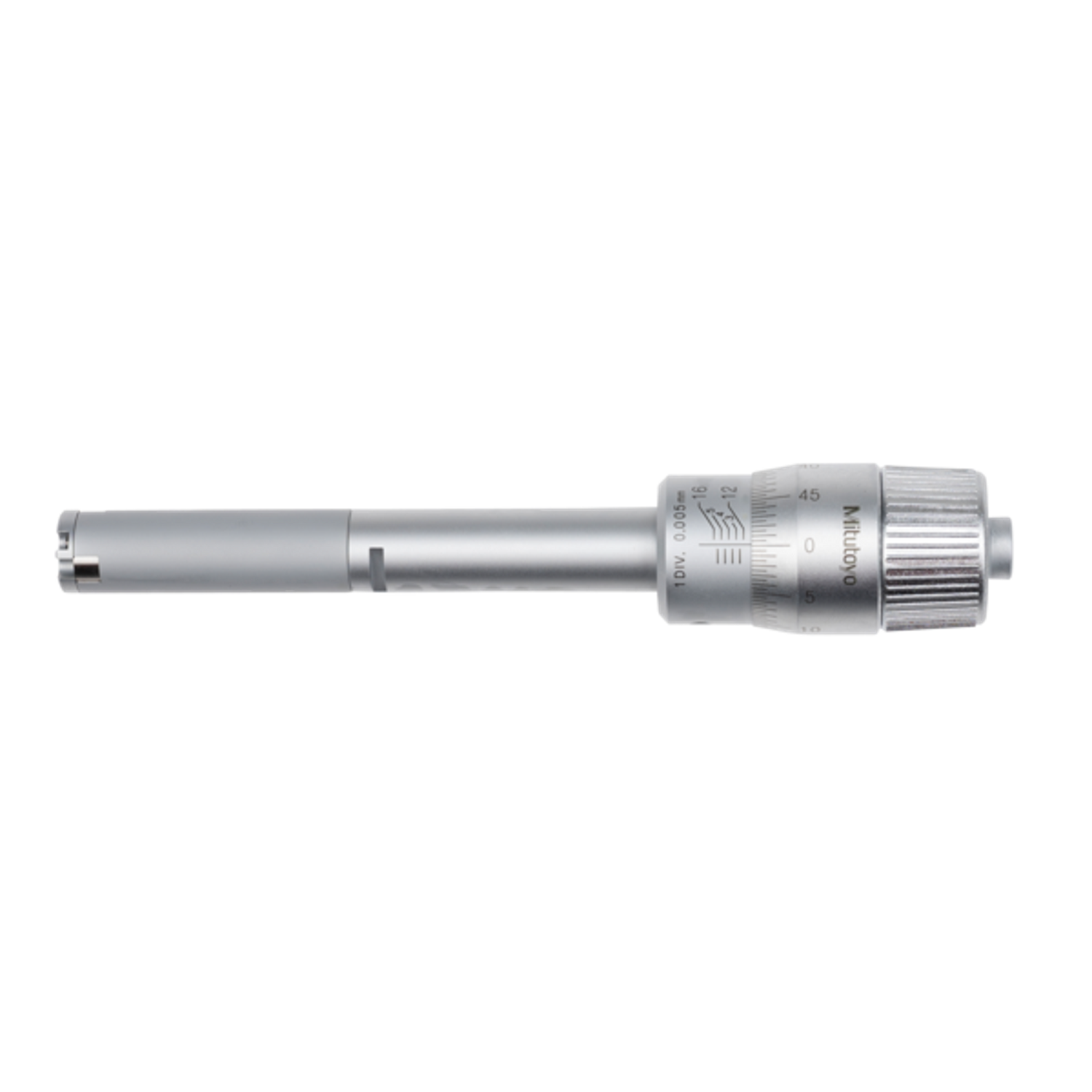 Un medidor de agujeros Mitutoyo no digital. Caras de contacto de acero endurecido. Un trinquete garantiza una medición repetible.