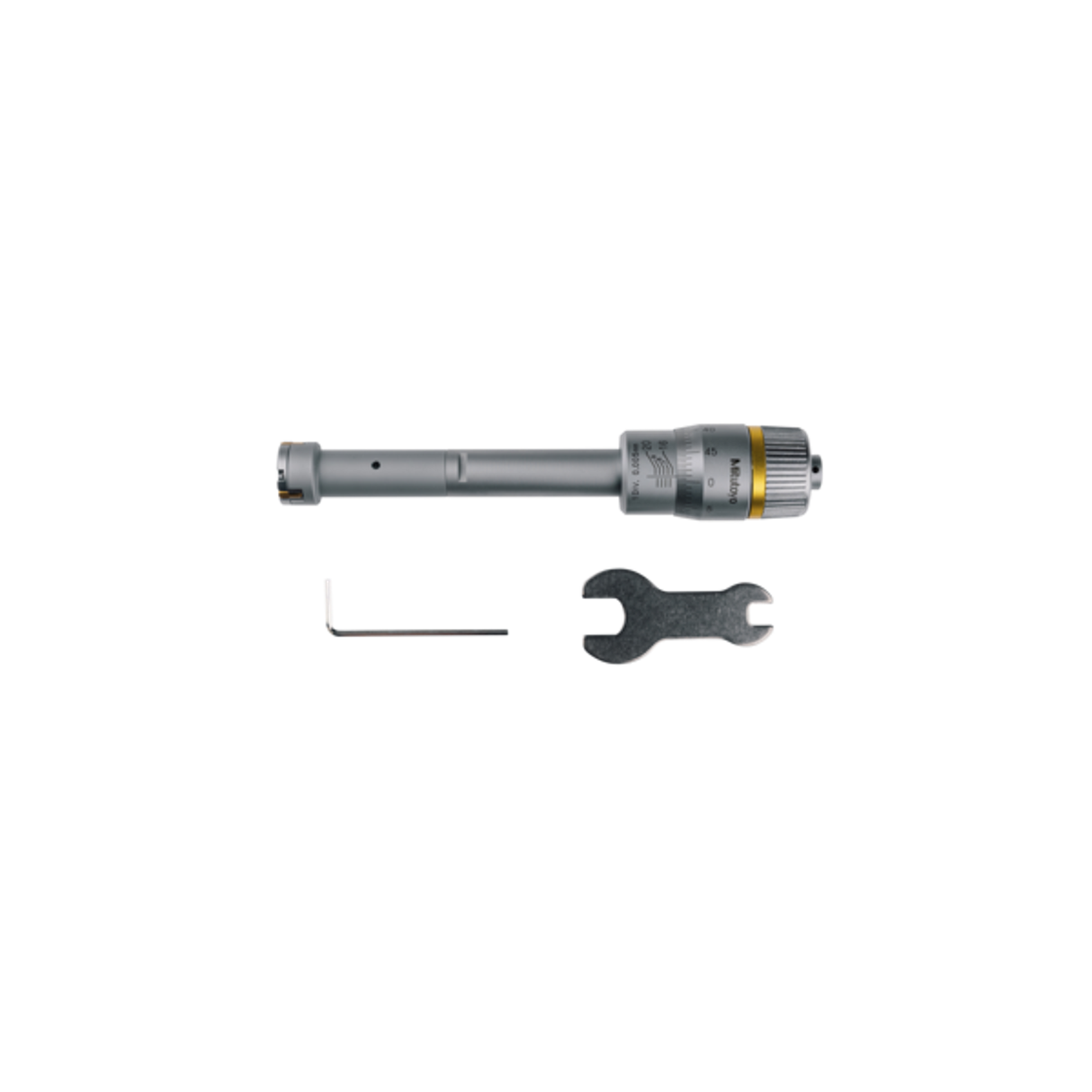 Micrómetro para agujeros Mitutoyo de 3 puntas no digital con pernos de medición recubiertos de titanio. El diseño de 3 puntos permite una medición estable mediante centrado automático. La profundidad máxima de medición se puede aumentar en 150 mm utilizando una varilla de extensión opcional si es necesario. El tope de trinquete garantiza una medición repetible. El Anillo de fijación de acero (opcional) está disponible para un ajuste exacto antes de la medición