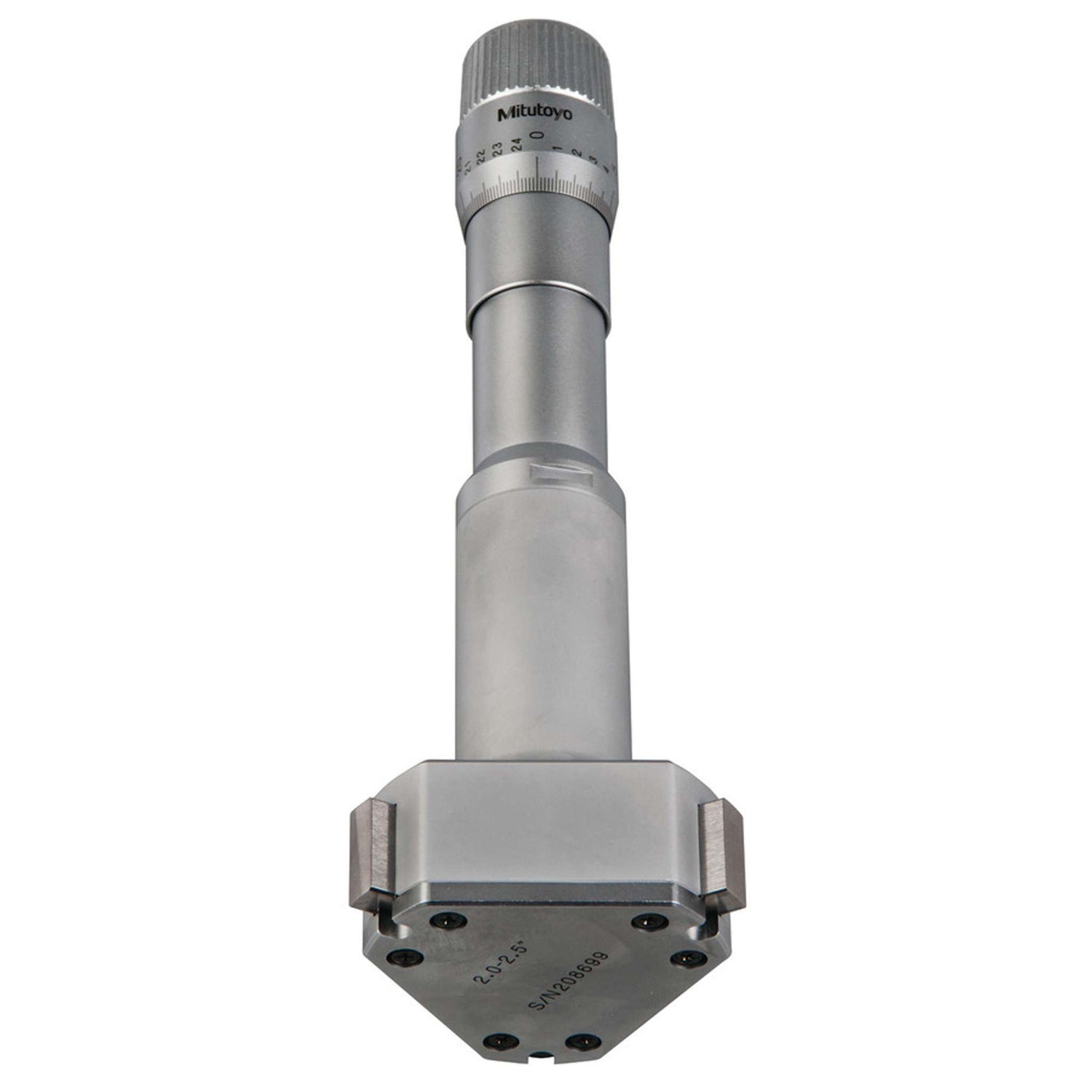 Un medidor de agujeros Mitutoyo no digital. Caras de contacto de acero endurecido. Un trinquete garantiza una medición repetible.