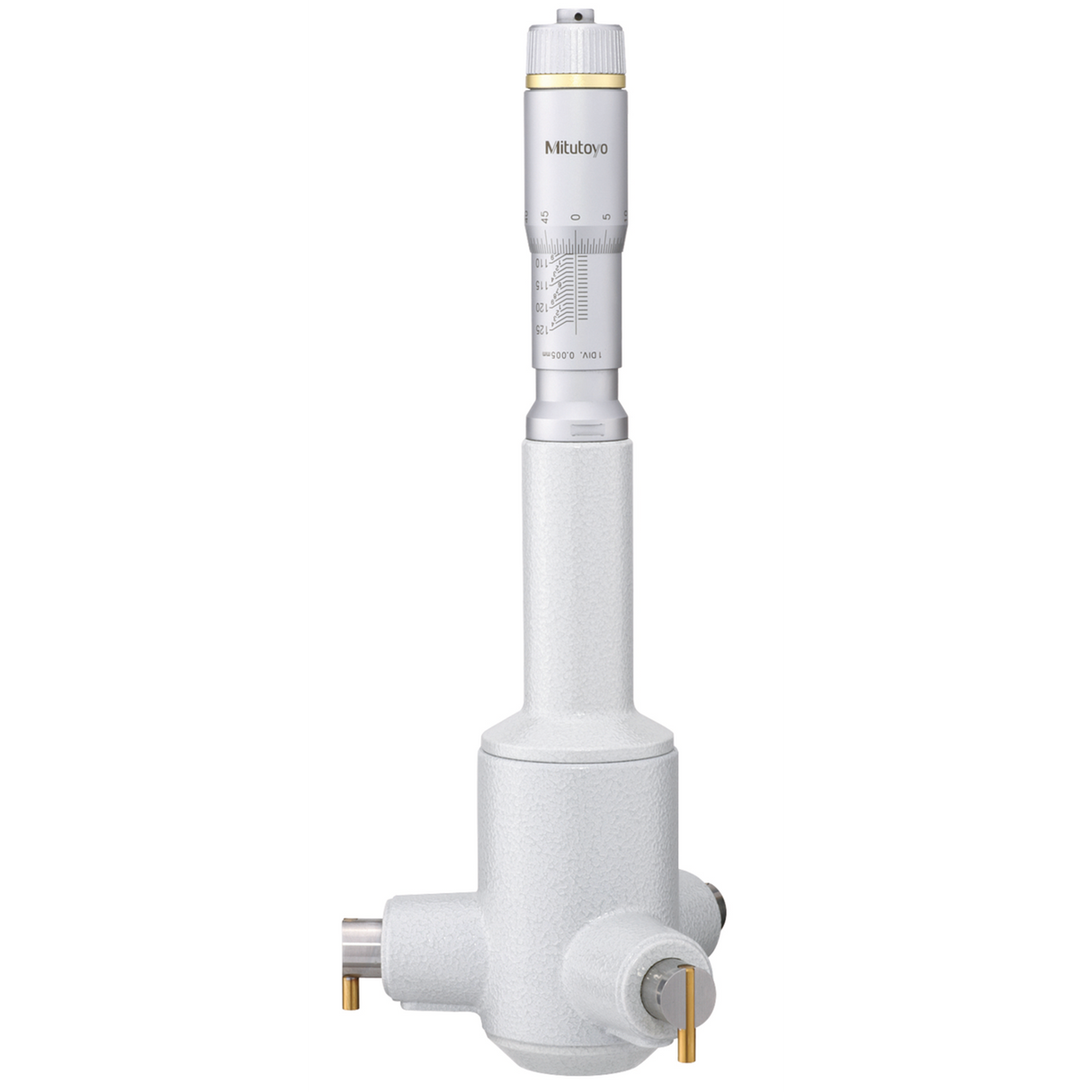 Micrómetros internos de tres y dos puntas le ofrecen los siguientes beneficios: Pernos de medición recubiertos de titanio le brindan una excelente durabilidad y resistencia al impacto (tipo de 3 puntos). El micrómetro de tres puntos permite una medición estable mediante el centrado automático. sin anillo de fijado o extensiones.