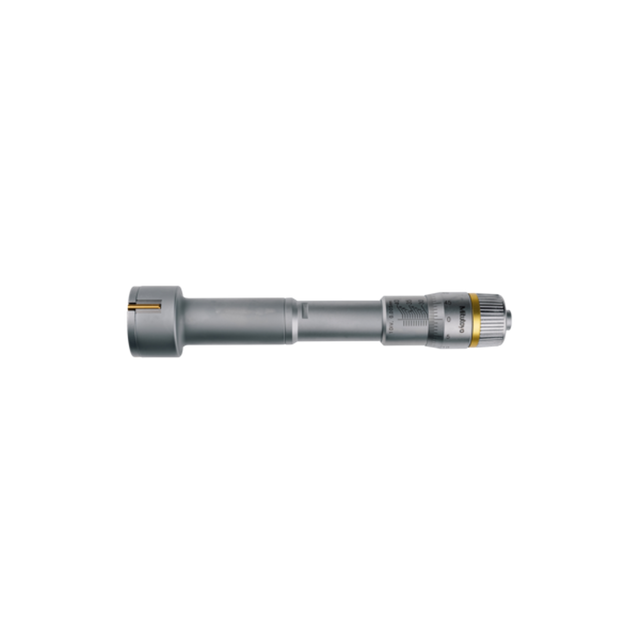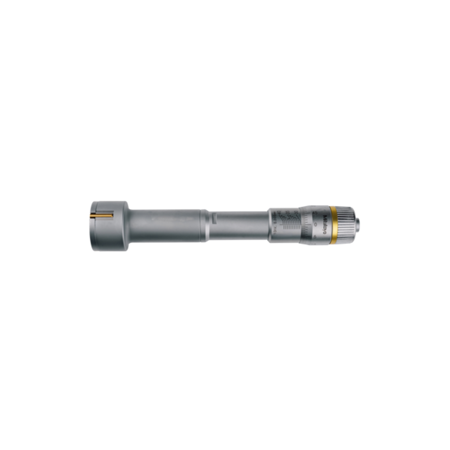 Micrómetro para agujeros Mitutoyo de 3 puntas no digital con pernos de medición recubiertos de titanio. El diseño de 3 puntos permite una medición estable mediante centrado automático. La profundidad máxima de medición se puede aumentar en 150 mm utilizando una varilla de extensión opcional si es necesario. El tope de trinquete garantiza una medición repetible. El Anillo de fijación de acero (opcional) está disponible para un ajuste exacto antes de la medición