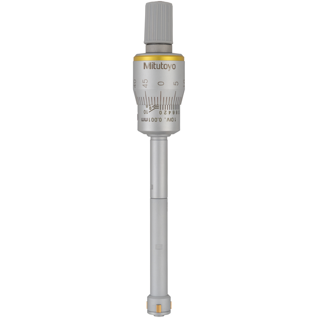Micrómetro para agujeros Mitutoyo de 3 puntas no digital con pernos de medición recubiertos de titanio. El diseño de 3 puntos permite una medición estable mediante centrado automático. La profundidad máxima de medición se puede aumentar en 100 mm utilizando una varilla de extensión opcional si es necesario. El tope de trinquete garantiza una medición repetible. El Anillo de fijación de acero (opcional) está disponible para un ajuste exacto antes de la medición
