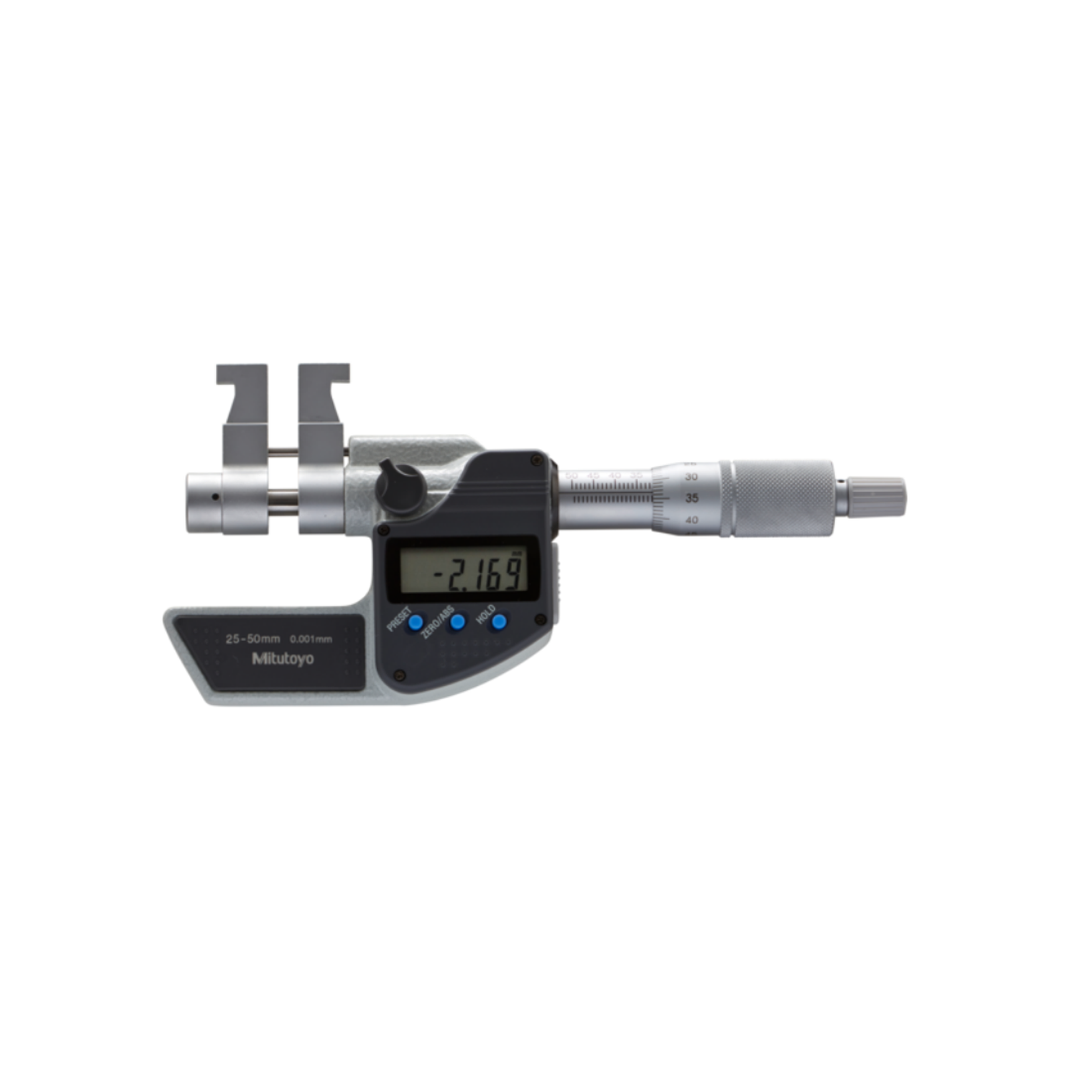Micrómetro de interiores Digimatic tipo calibrador ofrece los siguientes beneficios: Cara de medición de carburo necesita un patrón de ajuste (opcional) para ajustar con exactitud el micrómetro al punto de referencia.