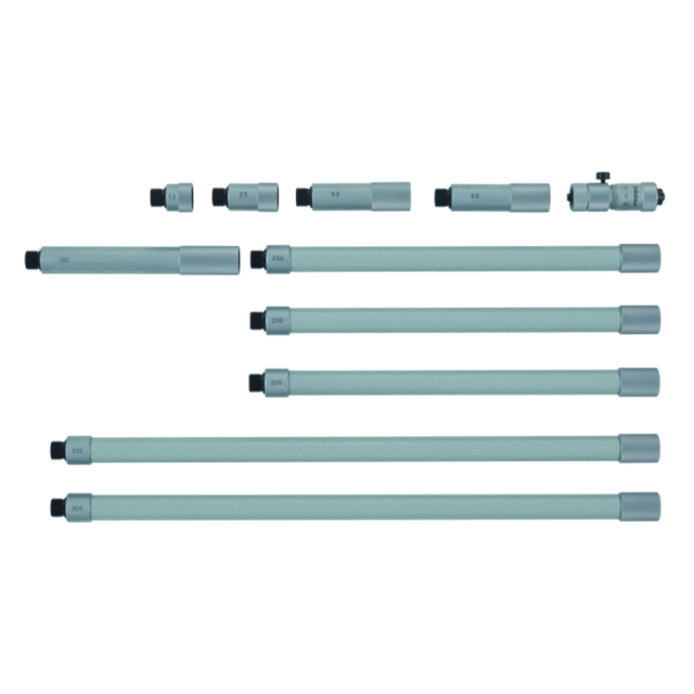 Micrómetro de interiores tipo varilla de interiores que ofrece los siguientes beneficios: Extensiones intercambiables con varilla de medición cilíndrica están montadas con resorte en fundas protectoras para que pueda ampliar el intervalo de medición. Hay disponibles caras de medición de carburo.
