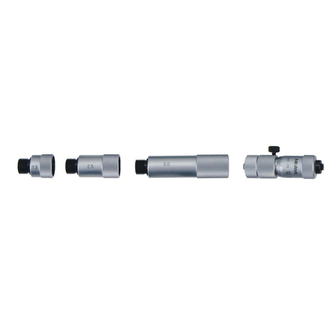 Micrómetro de interiores tipo varilla de interiores que ofrece los siguientes beneficios: Extensiones intercambiables con varilla de medición cilíndrica están montadas con resorte en fundas protectoras para que pueda ampliar el intervalo de medición. Hay disponibles caras de medición de carburo.