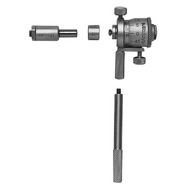 Micrómetro de interiores Mitutoyo que cubre un intervalo de medición mediante el uso de una varilla de medición intercambiable y un collar espaciador. La cabeza micrométrica tiene un acabado en cromo satinado