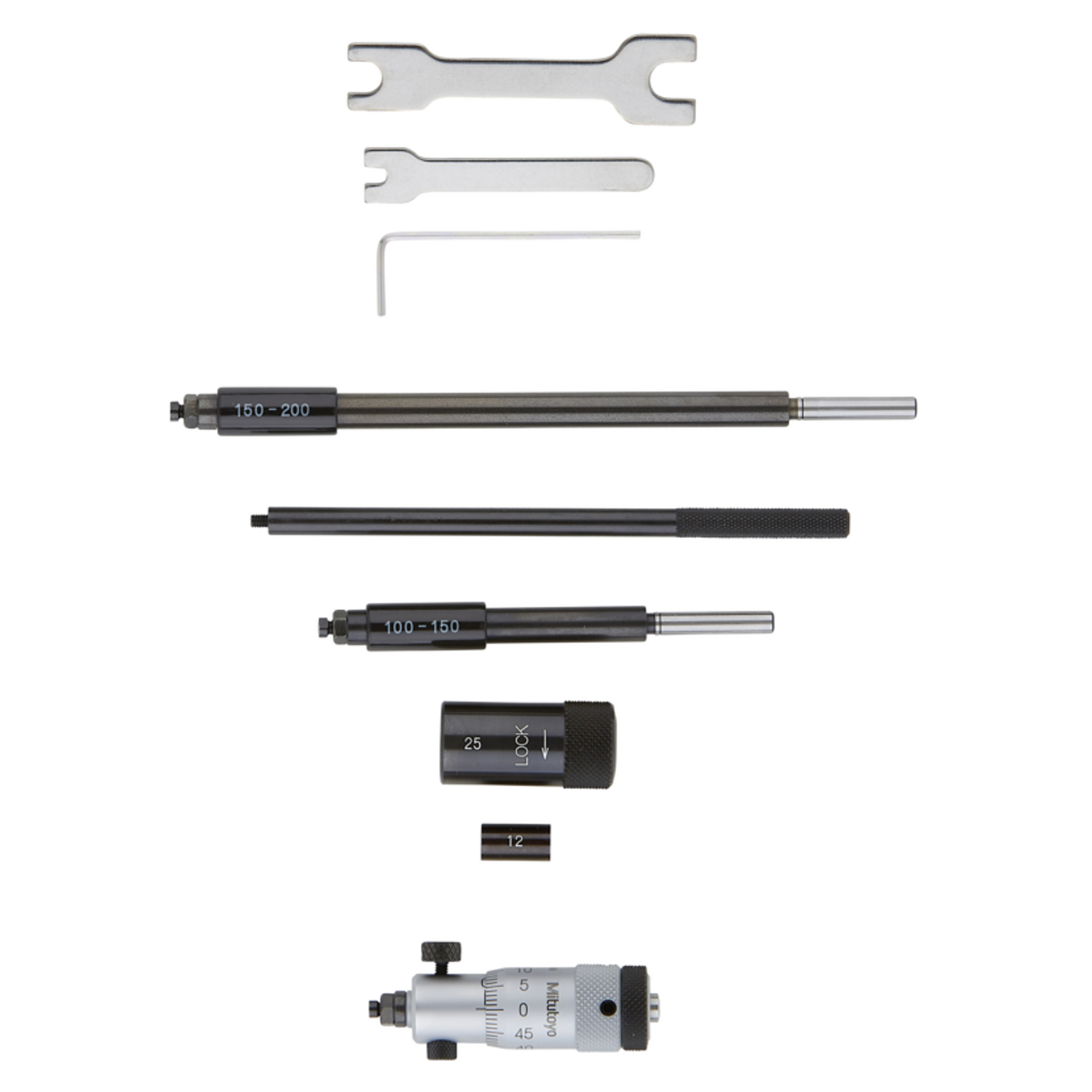 Micrómetro de interiores Mitutoyo que cubre un intervalo de medición mediante el uso de un conjunto de varillas de medición intercambiables. El intervalo de medición completo se logra combinando collarines espaciadores con las varillas. La cabeza micrométrica tiene un acabado en cromo satinado