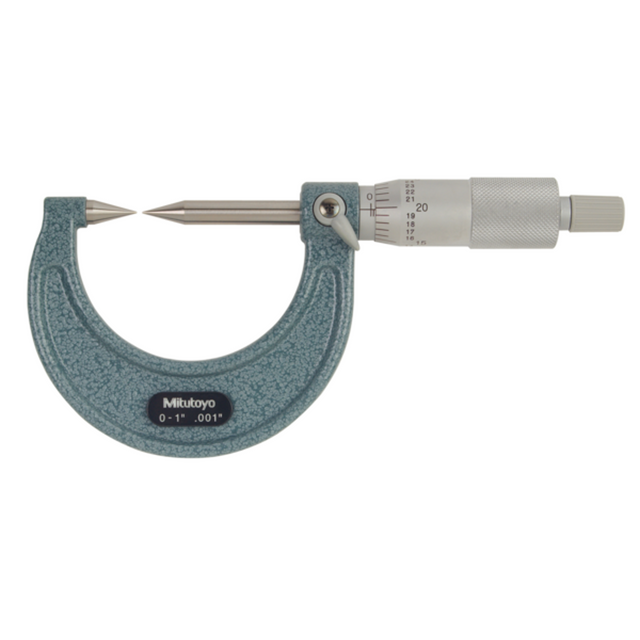 Un micrómetro no digital Mitutoyo provisto de un husillo puntiagudo y un tope para permitir la medición dentro de características curvas y ranuradas, como el espesor de la banda de la broca de perforación. Un Trinquete garantiza una medición repetible.