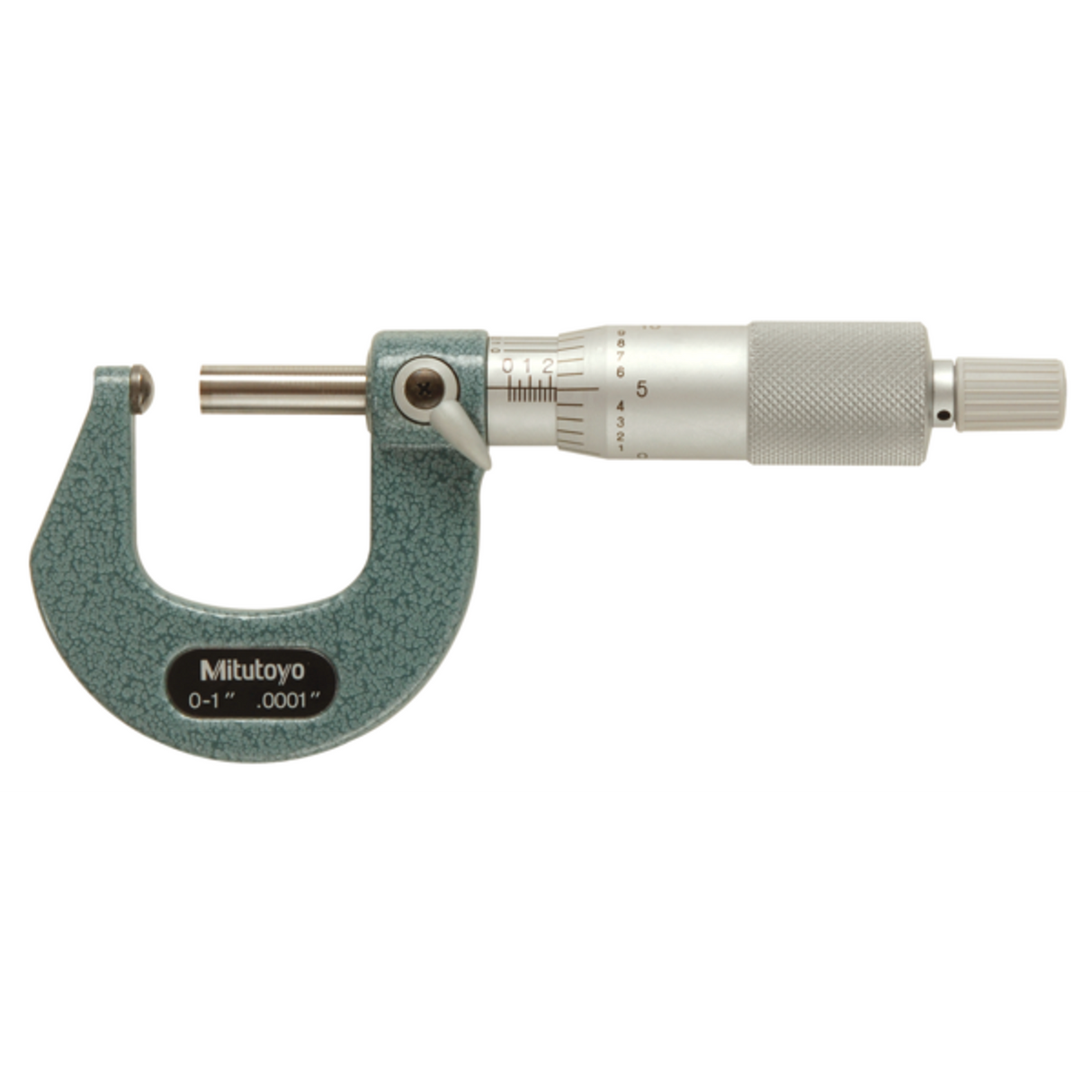 Un micrómetro de tubos no digital Mitutoyo equipado con un tope esférico para realizar mediciones del espesor de pared en tubos y tuberías. Un tope de Trinquete garantiza una medición repetible.