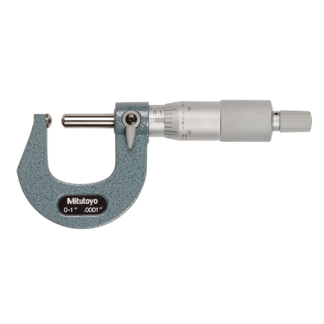 Un micrómetro de tubos no digital Mitutoyo equipado con un tope esférico para realizar mediciones del espesor de pared en tubos y tuberías. Un tope de Trinquete garantiza una medición repetible.