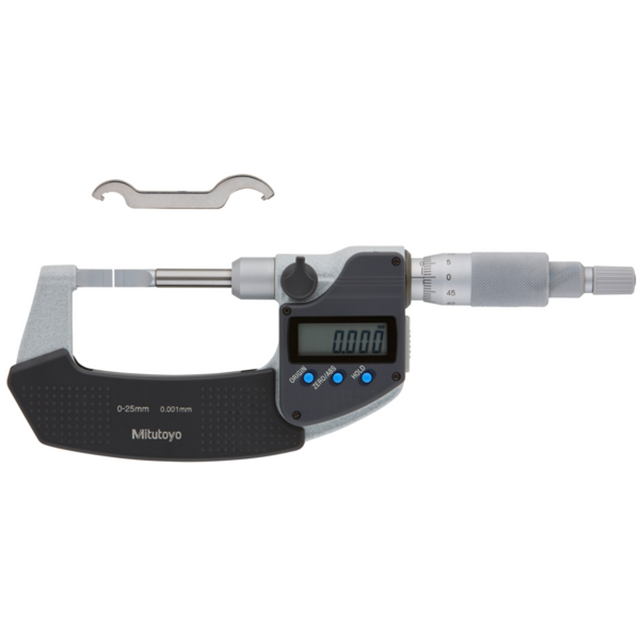 Este micrómetro de cuchilla Digimatic está diseñado para ayudarle a medir características difíciles de alcanzar. Ofrece los siguientes beneficios: Tope y husillo en forma de hoja para medir el diámetro de ranura de ejes, chaveteros y otras características difíciles de alcanzar Husillo no giratorio