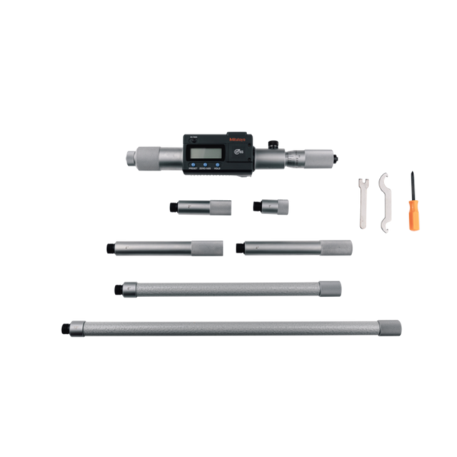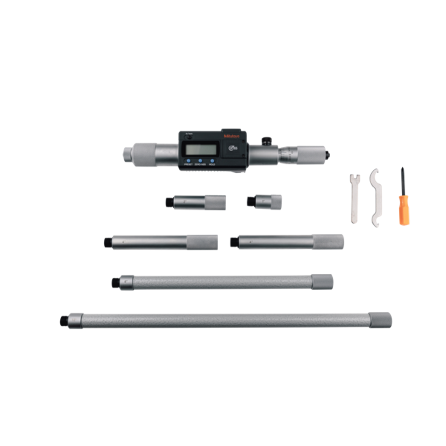 Micrómetro de interiores tipo varilla de interiores que ofrece los siguientes beneficios: Extensiones intercambiables con varilla de medición cilíndrica están montadas con resorte en fundas protectoras para que pueda ampliar el intervalo de medición. Caras de medición de carburo. Tipo Digimatic, con salida de datos. Tiene una excelente resistencia al agua y al polvo (nivel de protección IP65), lo que le permite utilizarlo en situaciones de mecanizado que incluyen salpicaduras de líquido refrigerante.